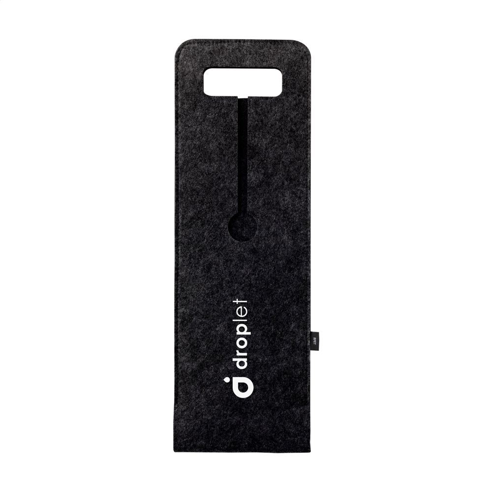 Das Produkt trägt das GRS-Zertifikat. Dies gewährleistet die Rückverfolgbarkeit der recycelten Fasern. Die Weintasche bietet Platz für eine Weinflasche mit circa 7,5 cm Durchmesser. Sie ist in den Farben Schwarz und Grau verfügbar. Die Weintasche ist langlebig und für die Wiederverwendung gedacht. Der verwendete Filz ist robust und formstabil.