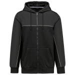 Das Material besteht aus 60% Baumwolle und 40% recyceltem Polyester. Die Einsätze sind aus wasserabweisendem 2-Lagen Softshell. Das Vest hat eine praktische, durchgehende Reißverschlussleiste. Es verfügt über zwei Kängurutaschen. Die Kapuze ist zweiteilig und mit einer Kordel versehen. Kontrastierende Elemente sind an Vorder- und Rückseite angebracht. Das Vest ist in der Farbe Dark Grey verfügbar. Wir bieten eine große Auswahl an Größen von XS bis 5XL.