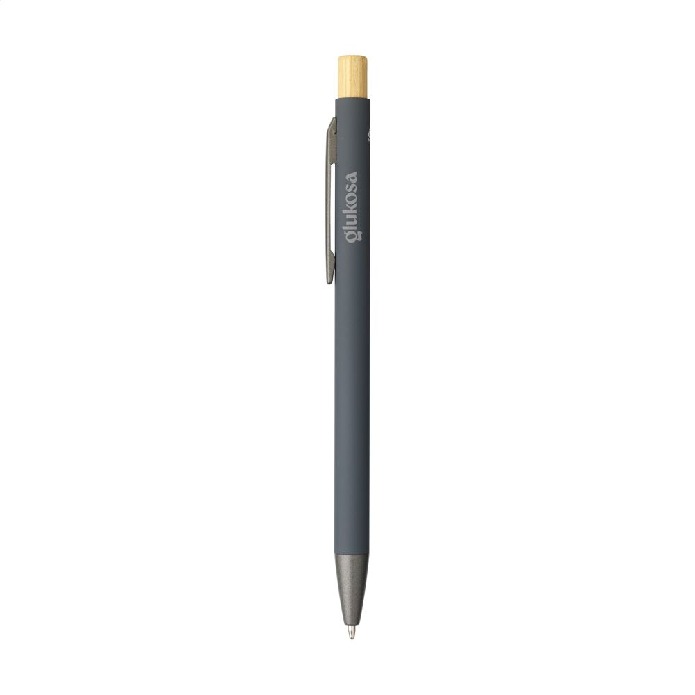 Das Gehäuse besteht vollständig aus recyceltem Aluminium mit einer Soft-Touch-Oberfläche. Der Druckknopf ist aus echtem Bambusholz gefertigt. Das Modell schreibt mit blauer Tinte und besitzt eine schlanke Form. Du kannst zwischen den Farben Navy, Weiß, Schwarz, Rot, Grau und Grün wählen. Der Stift ist als variables Produkt für verschiedene Anforderungen verfügbar. Die GRS-Zertifizierung garantiert die Herkunft der recycelten Materialien.