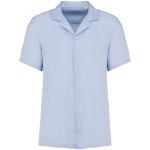The shirt is made from 100% linen fabric. It features a woven construction. It has a straight cut. The design includes a bowling collar. A lined back yoke adds comfort. You will find single needle stitching at the cuffs and hem. The button placket has contrasting mother-of-pearl buttons. These buttons are made from recycled plastic. The interior finish includes an overlay. The garment is washed after assembly. Colors may show slight variations per product. Available sizes range from XS to 3XL. You can choose between Linen and Linen Blue colors.