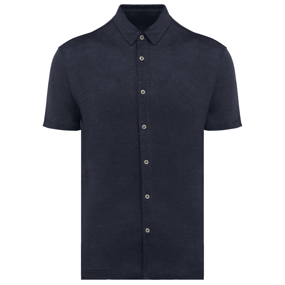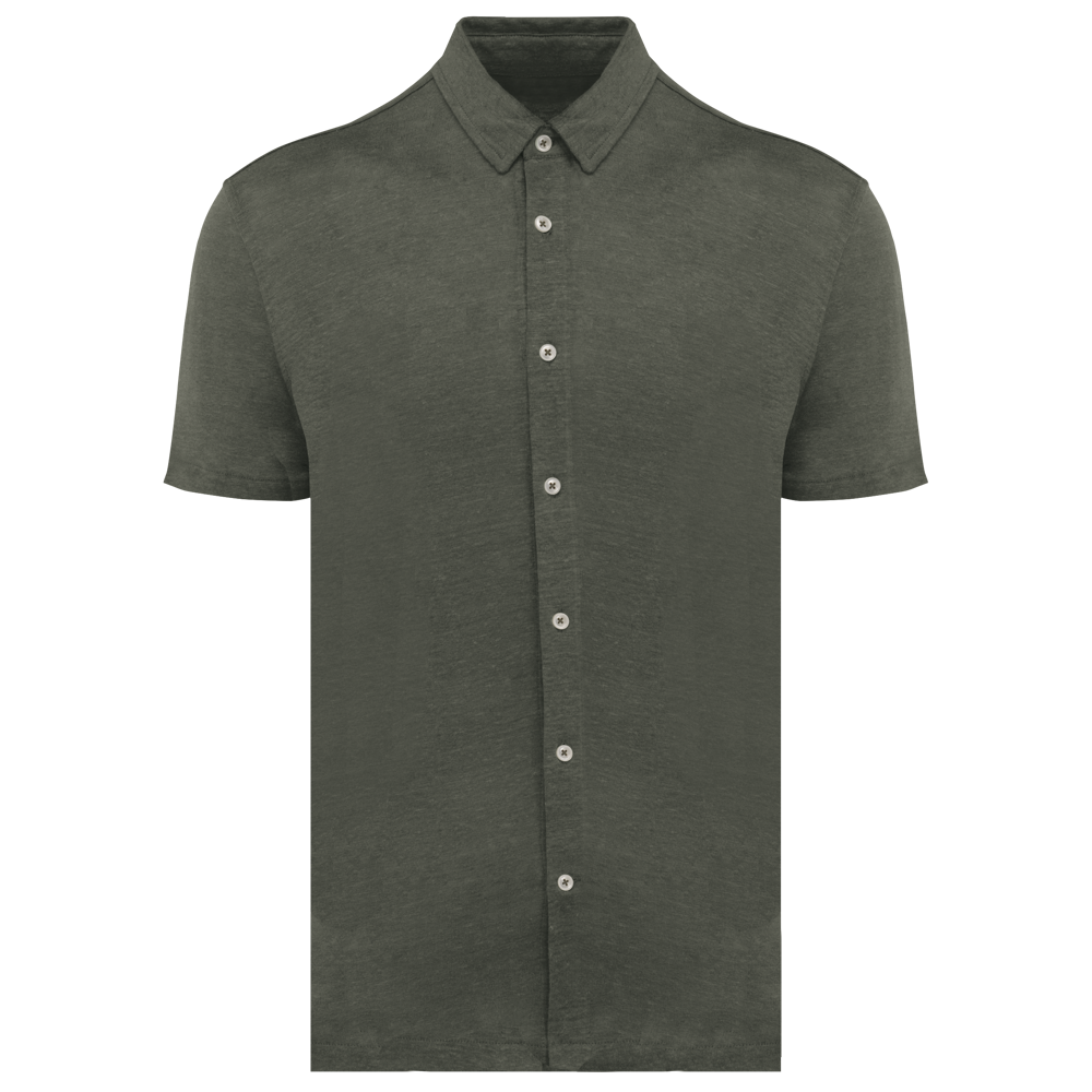 This is a breathable men's short-sleeved linen shirt. You can customize this shirt with your own logo. It is suitable for various promotional activities and professional settings.