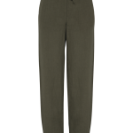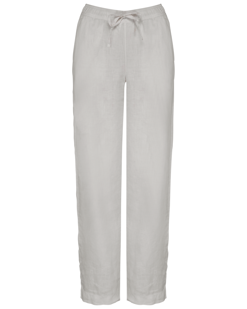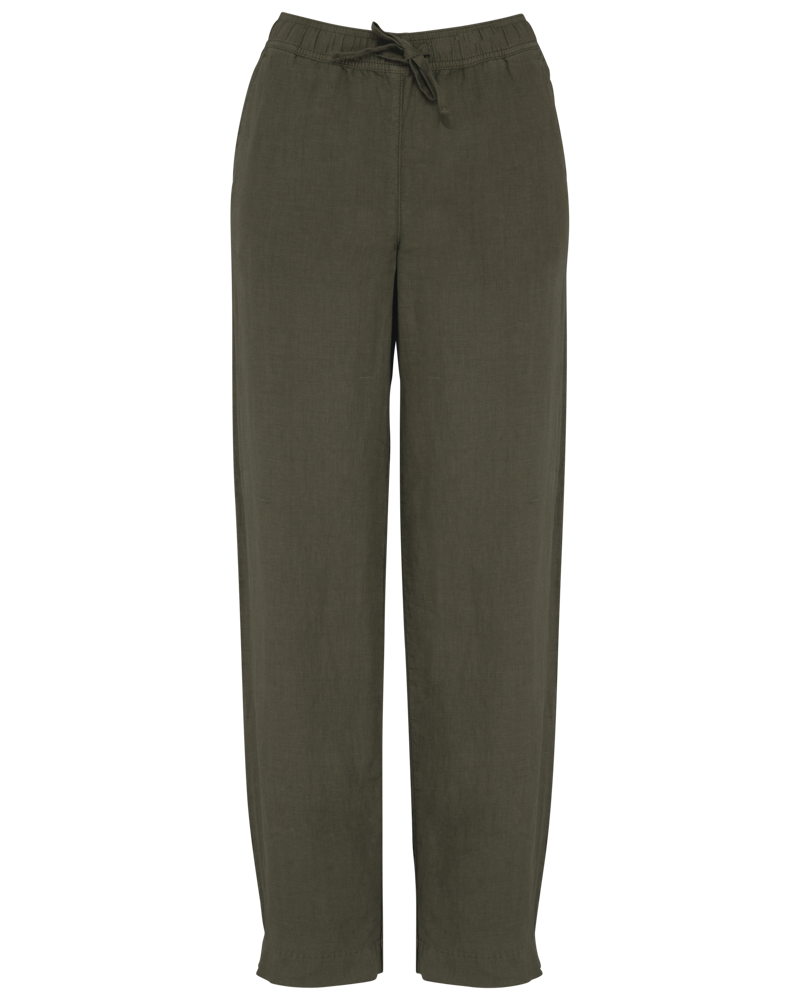 The trousers are made from 100% linen. They feature a woven fabric construction. You will appreciate the washed look. The cut is wide for comfort. An elastic waistband includes a flat drawstring. The drawstring matches the main fabric color. Embroidered ventilation eyelets are present. The waistband has an inner piping finish. Side pockets feature piping details. Piping stitches are at the front and back. Reinforcing piping stitches are also included. Applied back pockets have stitching. A visible hem finishes the bottom. Garment dyeing after assembly can cause slight color variations between products. This product may transfer color to lighter fabrics or clothing.
