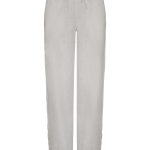 These are the Linen Women's Trousers SP733. They offer a washed look and a wide cut. These trousers are made from 100% linen material. You can customize them with your own logo. They are available in Washed Navy Blue, Washed Organic Khaki, and Washed White.