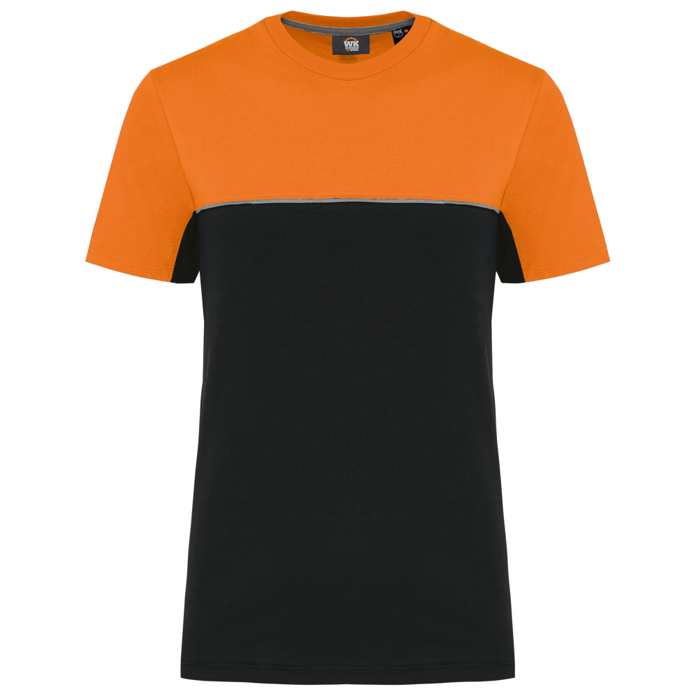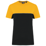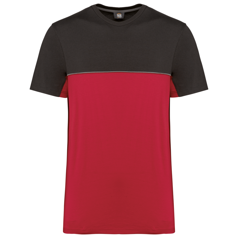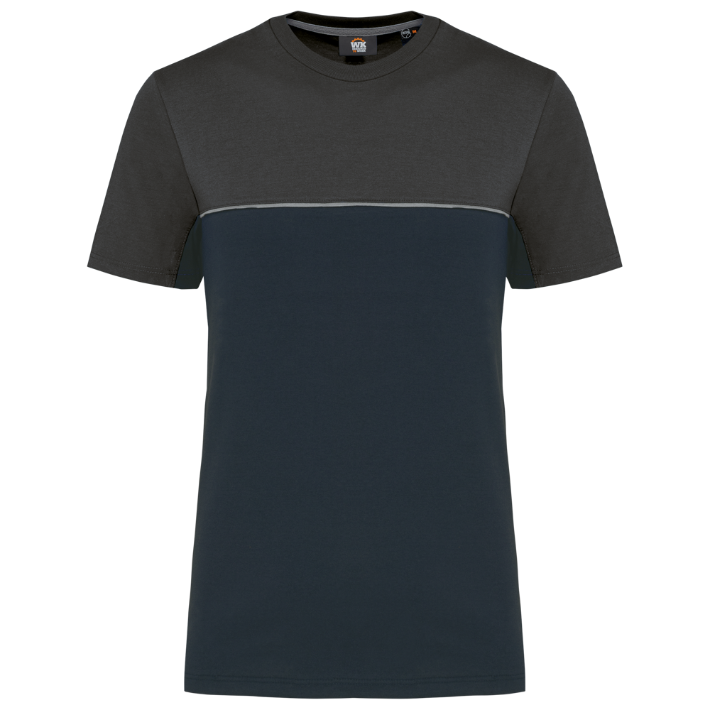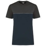 This is a unisex, two-tone ecological T-shirt. It is designed for workwear and promotional use. The T-shirt combines comfort with sustainability. It is made from 60% combed cotton and 40% recycled polyester. The fabric features Vortex yarn and a Jersey knit. It has an anti-pilling treatment for lasting quality.