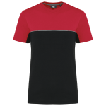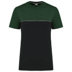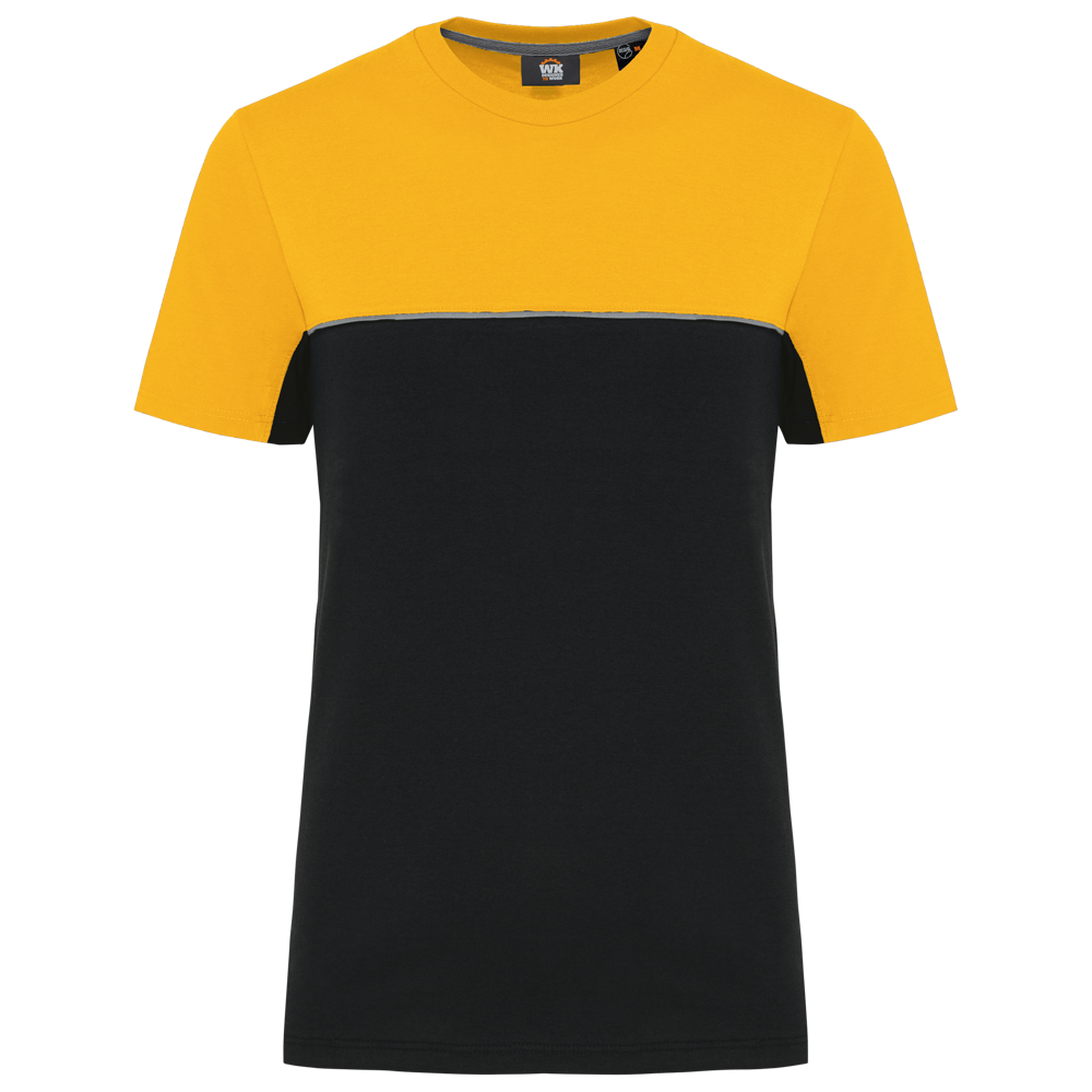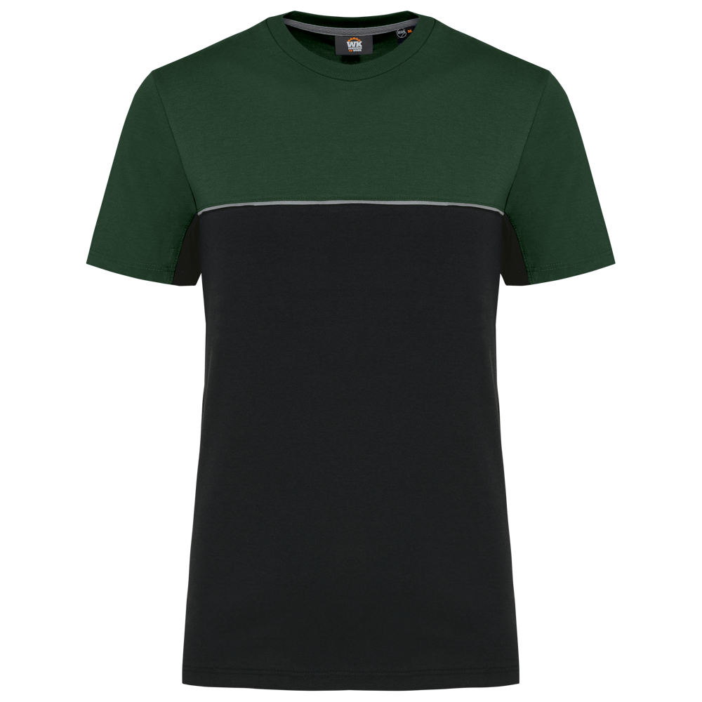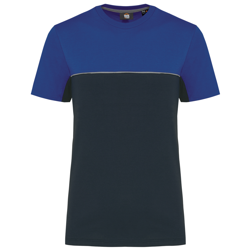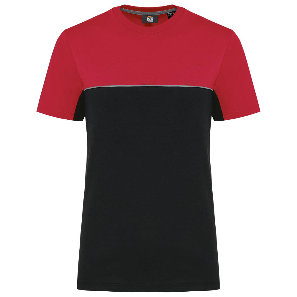 This is a unisex, two-tone ecological T-shirt. It is designed for workwear and promotional use. The T-shirt combines comfort with sustainability. It is made from 60% combed cotton and 40% recycled polyester. The fabric features Vortex yarn and a Jersey knit. It has an anti-pilling treatment for lasting quality.