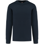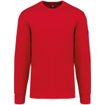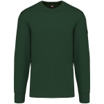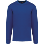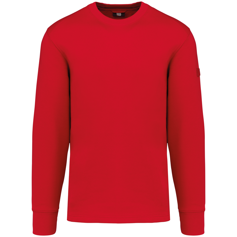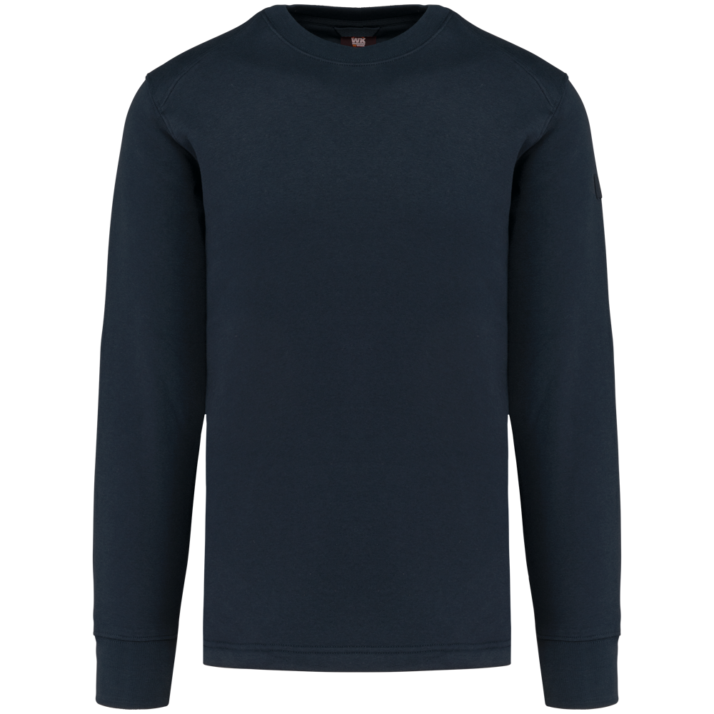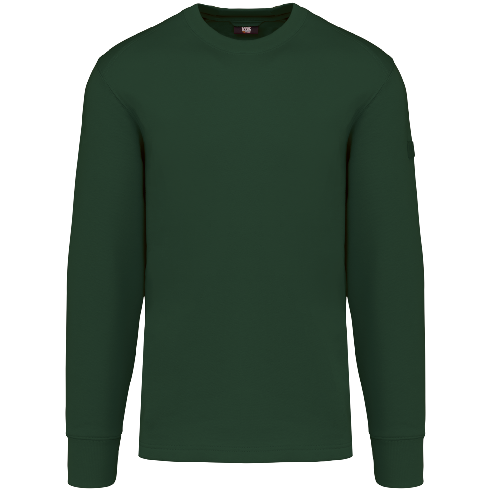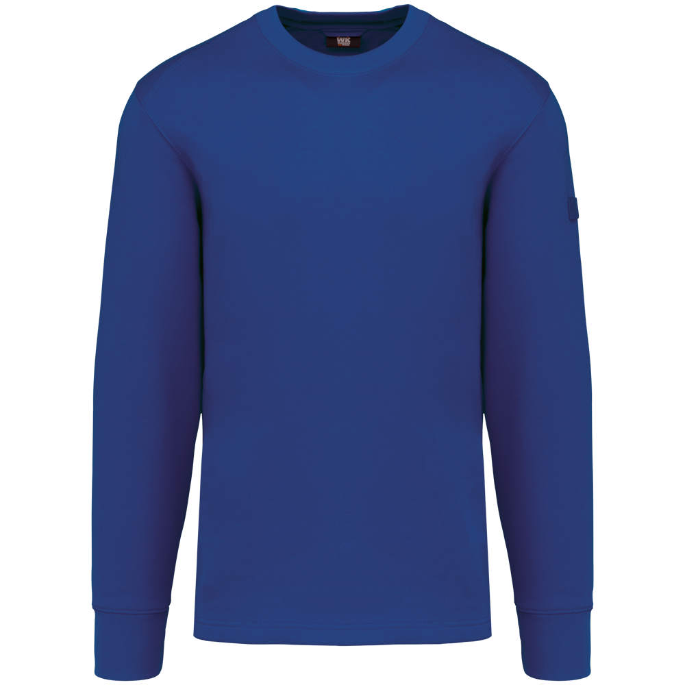 The sweater is made from 80% cotton and 20% polyester fleece. It features LSF treatment, ensuring low shrinkage. You can wash this item at 60°C. It has a classic round neck and ribbed cuffs. An invisible zip pocket is located on the right side. Shoulders and elbows are reinforced for durability. A practical pen holder is present on the left sleeve. The back has a half-moon finish. A hanging loop is included in the collar. The bottom hem features a double-stitched finish. An extended back panel offers additional comfort. The WK4001 is available in sizes XS to 8XL. You can choose from Navy, Black, Forest Green, Red, Royal Blue, and Dark Grey.