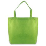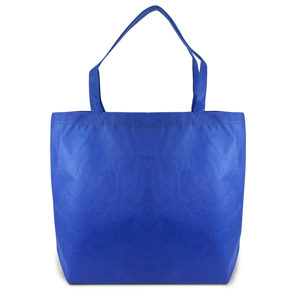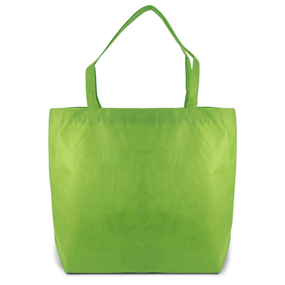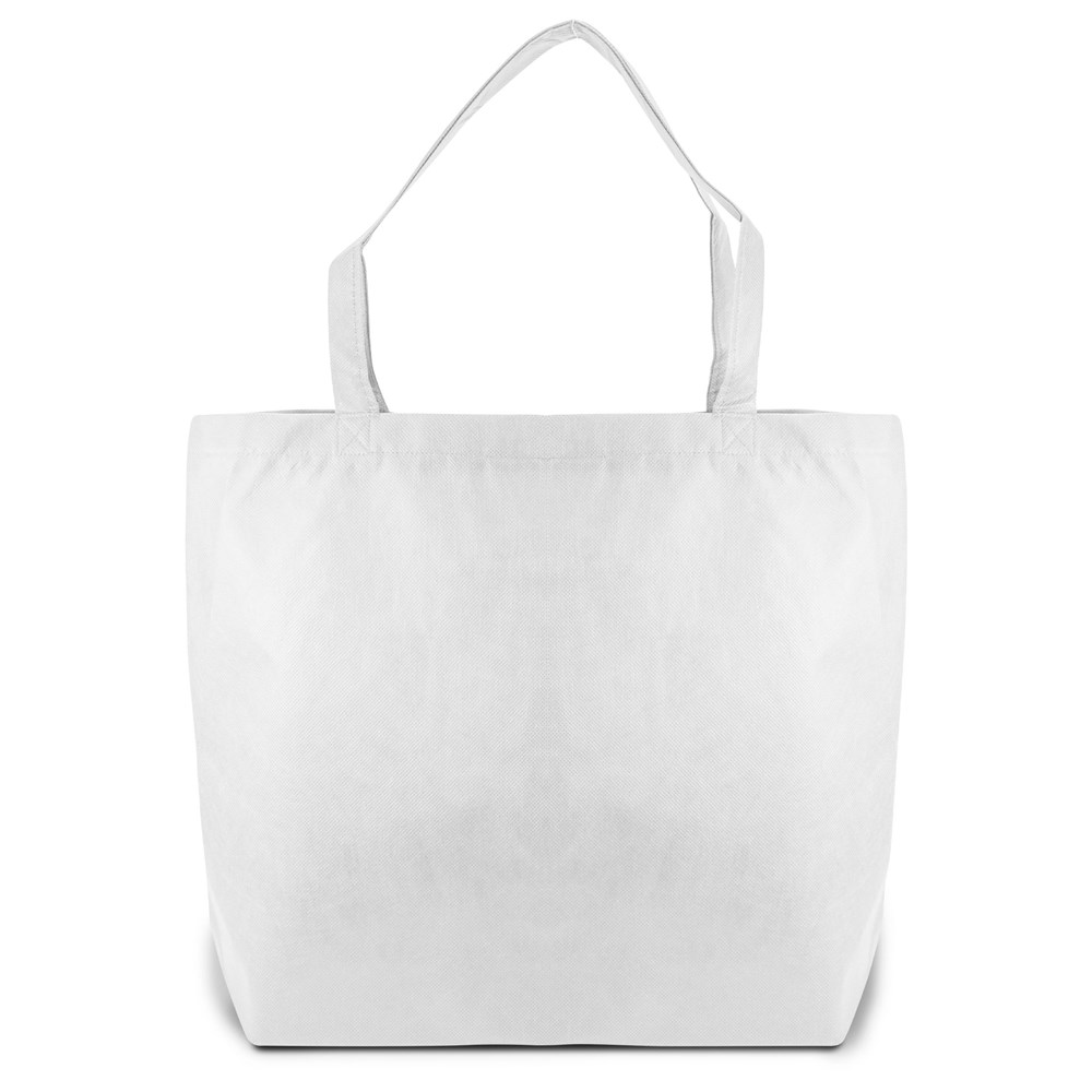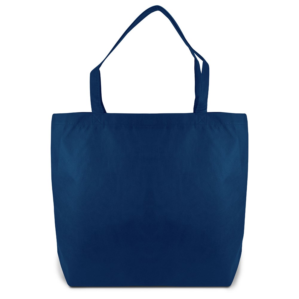 This is a large non-woven tote bag. It features a secure zipper closure. The bag is made from light and tear-resistant Premium-PP Non-woven material. It includes pleats at the bottom for extra volume. You can customize this tote bag with your own logo.