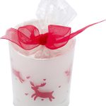 The Kirsten Glass Candle Holder is a decorative item. It features a festive Christmas decoration. A tealight is included with each holder. It comes packaged in transparent foil. A red ribbon ties the package. This makes it ready as a gift or promotional item.