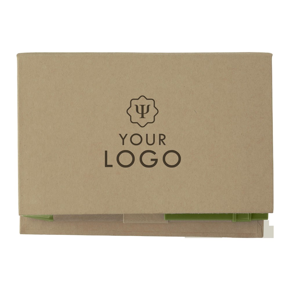 You are looking at the Glenn Cardboard Memo Holder with Pen Set. This product provides a practical solution for your notes and includes a pen. It is designed for branding, allowing you to feature your own logo prominently.