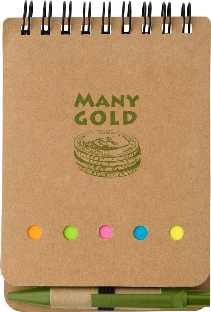 This set includes a black-writing pen, 60 lined sheets, and 25 adhesive notes for organizational use. It is commonly used as a giveaway for business clients, associations, and events.