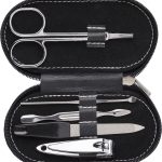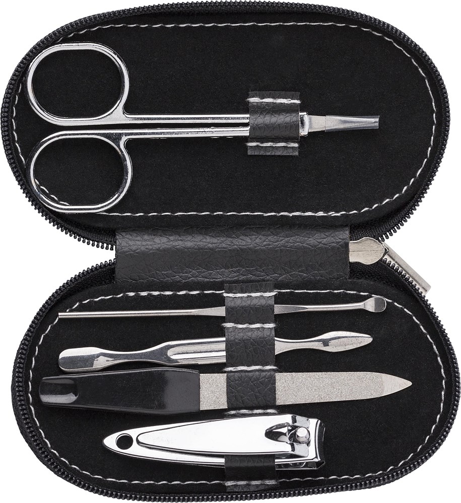 This is a compact 5-piece manicure set. It comes in a black PVC case. You can easily carry this set with you.