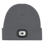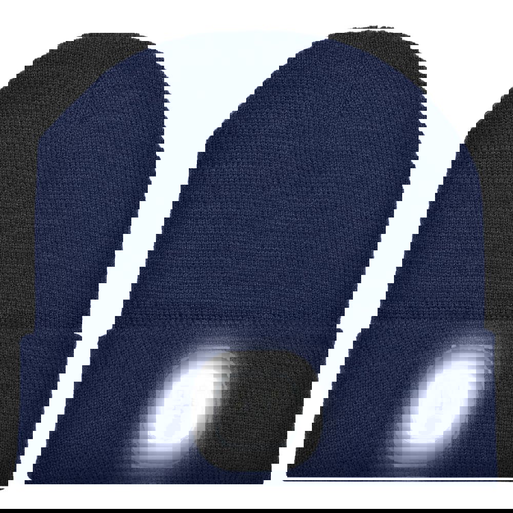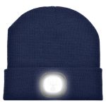 This is a custom knitted promotional beanie with an integrated light source. The LED Beanie combines safety and brand visibility. It provides reliable warmth. The product features an LED lamp positioned at the front. The lamp is fully rechargeable. It is available in standard colors including Dark Grey, Navy, and Black.