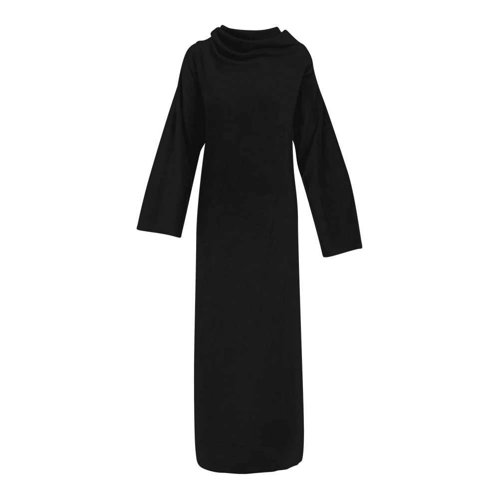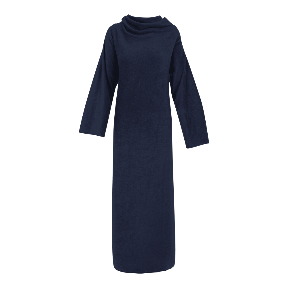 The product dimensions are 150x120 cm, offering generous coverage. This item is made of soft fleece material for maximum comfort. The design includes long sleeves, distinguishing it from standard blankets. The fleece plaid is available in standard colors such as Navy and Black. The fabric is durable and suitable for repeated use. It is easy to fold and store when not in use.