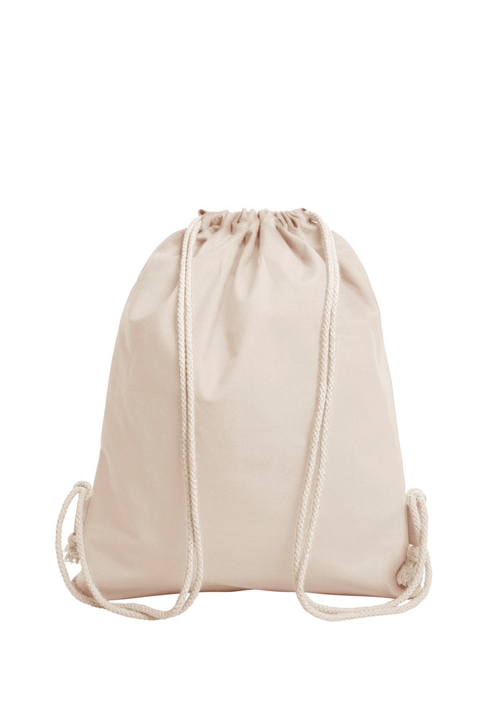 The backpack material is durable organic cotton. It features one main storage compartment. The drawstring mechanism doubles as the shoulder strap and closure. This ensures secure and easy access to contents. The standard color is Natural, which suits a wide variety of logos. This lightweight bag is comfortable for users to carry.