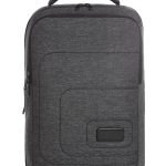 This backpack provides multiple compartments for highly organized storage. It features a dedicated, fully padded notebook compartment with zipper closure. The main compartment is lined and is compatible with DIN A4 documents. A zippered front pocket includes internal slip pockets for small accessories. The padded back panel features a hidden zippered security pocket. Adjustable, padded shoulder straps ensure comfortable carrying. A functional trolley strap allows secure attachment to rolling luggage handles. The exterior color is Black-grey speckled.