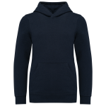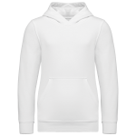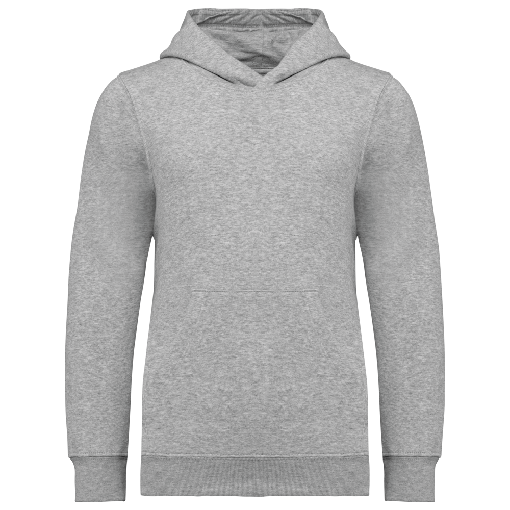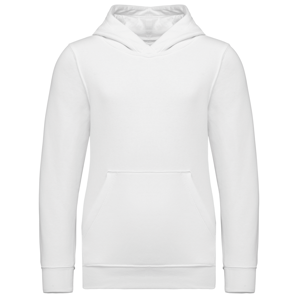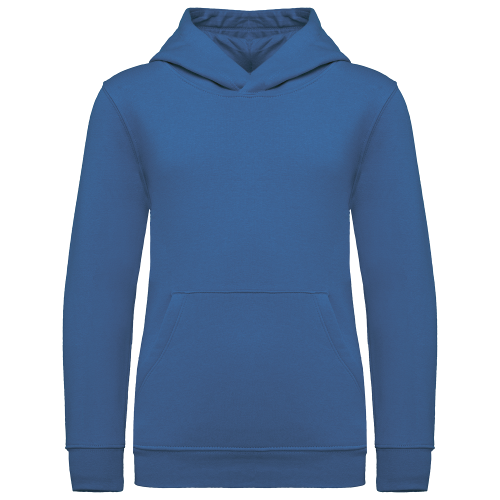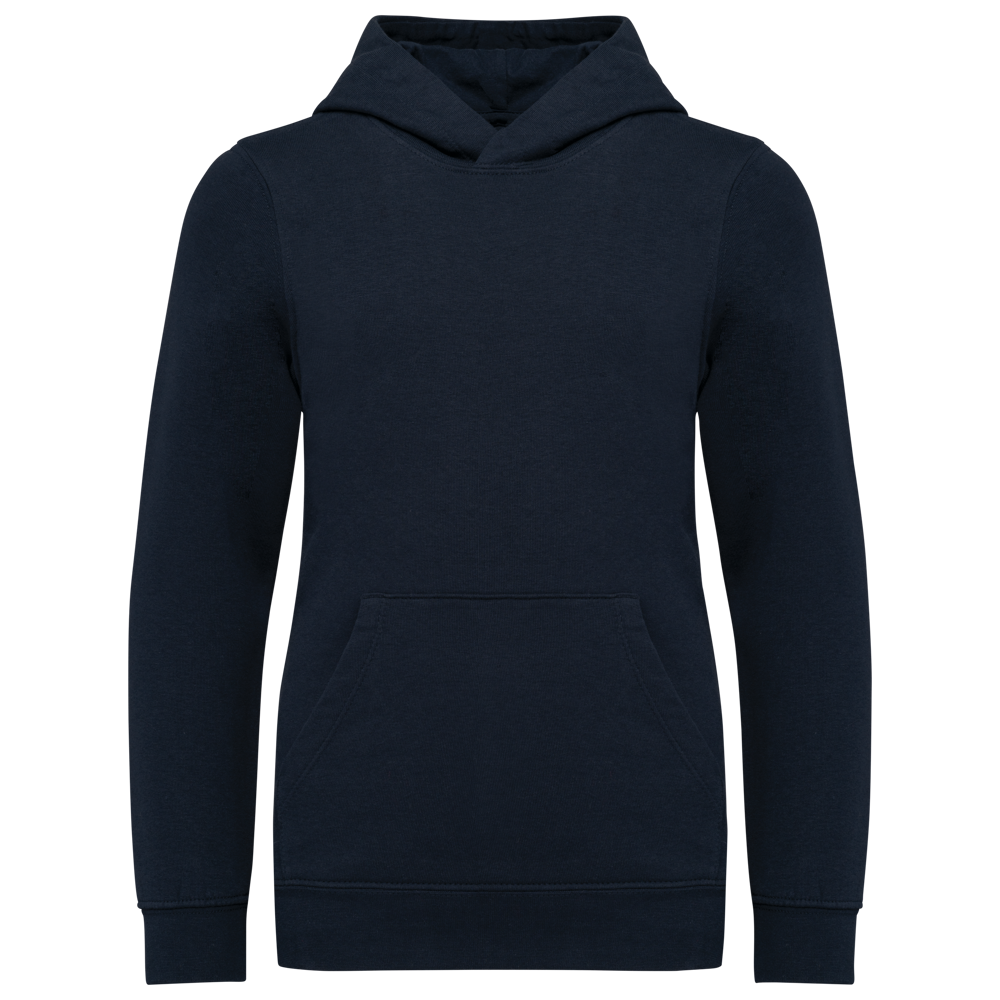 The kids' hoodie consists of 80% cotton and 20% polyester. It uses combed cotton for a softer feel. The fabric is a 3-layer LSF brushed fleece. This fleece has an anti-pilling treatment for durability. The hoodie is made with a straight cut. It includes 1x1 ribbed cuffs and hem. The hood is lined with soft jersey cotton. Double stitching reinforces the shoulders and armholes. The cuffs and hem also feature double stitching. A matching jersey neck tape is inside the collar. It has a practical kangaroo pocket. A half-moon insert is located at the back. A name label is sewn into the garment. Available in sizes 4, 6, 8, 10, 12, and 14 years. Choose from colors Navy, Black, White, Red, Light Royal Blue, and Oxford Grey.