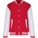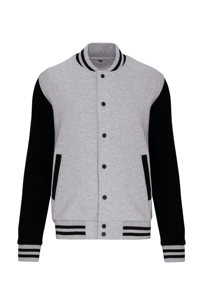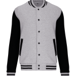 This college jacket consists of 70% cotton and 30% polyester. It features a brushed 3-thread fleece for comfort. The jacket has contrasting set-in sleeves for a classic look. It closes at the front with snap buttons. You will find ribbed trim with two contrasting stripes on the collar, cuffs, and hem. The jacket includes two piped front pockets for convenience. A herringbone neck tape and a hanging loop are present in the collar. You benefit from a label-free neck area, containing only a size label.