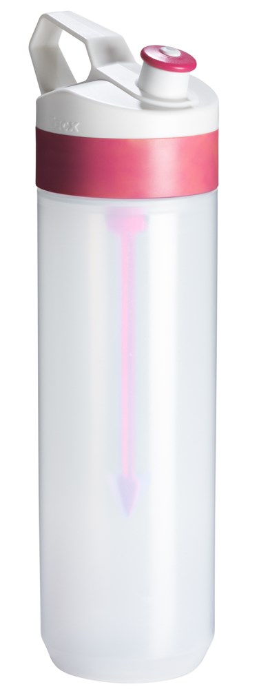 The material is soft, squeezable, BPA-free polyethylene. It offers a total volume capacity of 450 ml. The bottle includes a dedicated internal stick for fruit infusion. It is designed with a practical pull spout for easy drinking access. A small integrated carry handle enhances portability. The Tacx Fuse Bottle is generally suitable for dishwasher cleaning.