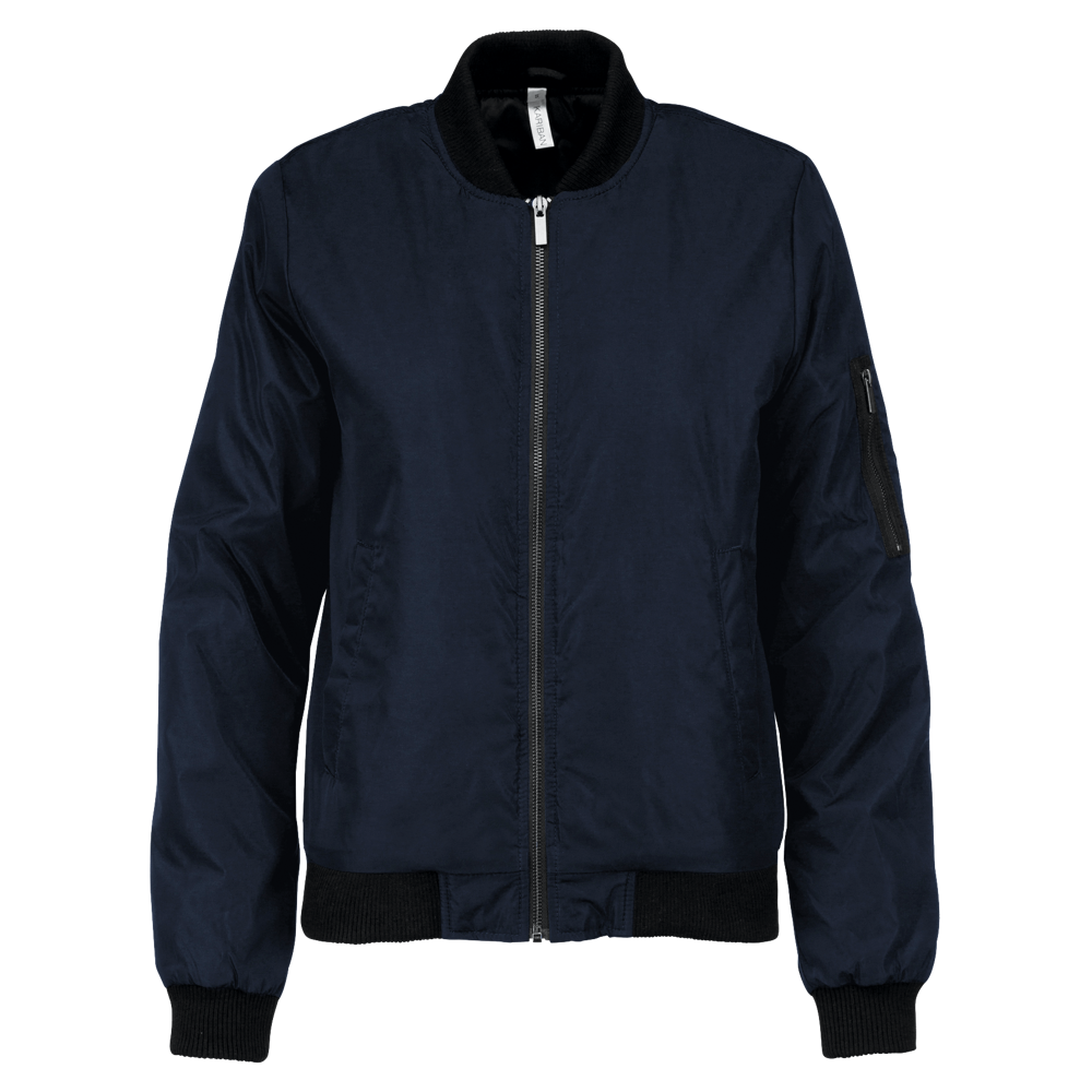 This is the K6123 women's bomber jacket. It is crafted entirely from 100% polyester. The jacket offers a versatile option for your team or event needs.