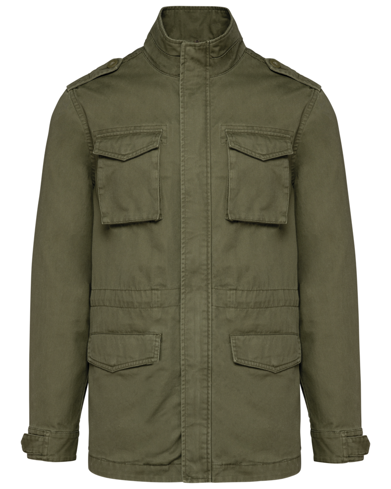 The K6164 Men's Safari Jacket is a durable and stylish garment. It is made from 100% cotton with a twill construction. This jacket features a regular fit. Each jacket undergoes a special washing process. This process creates unique color variations, making every piece distinct.