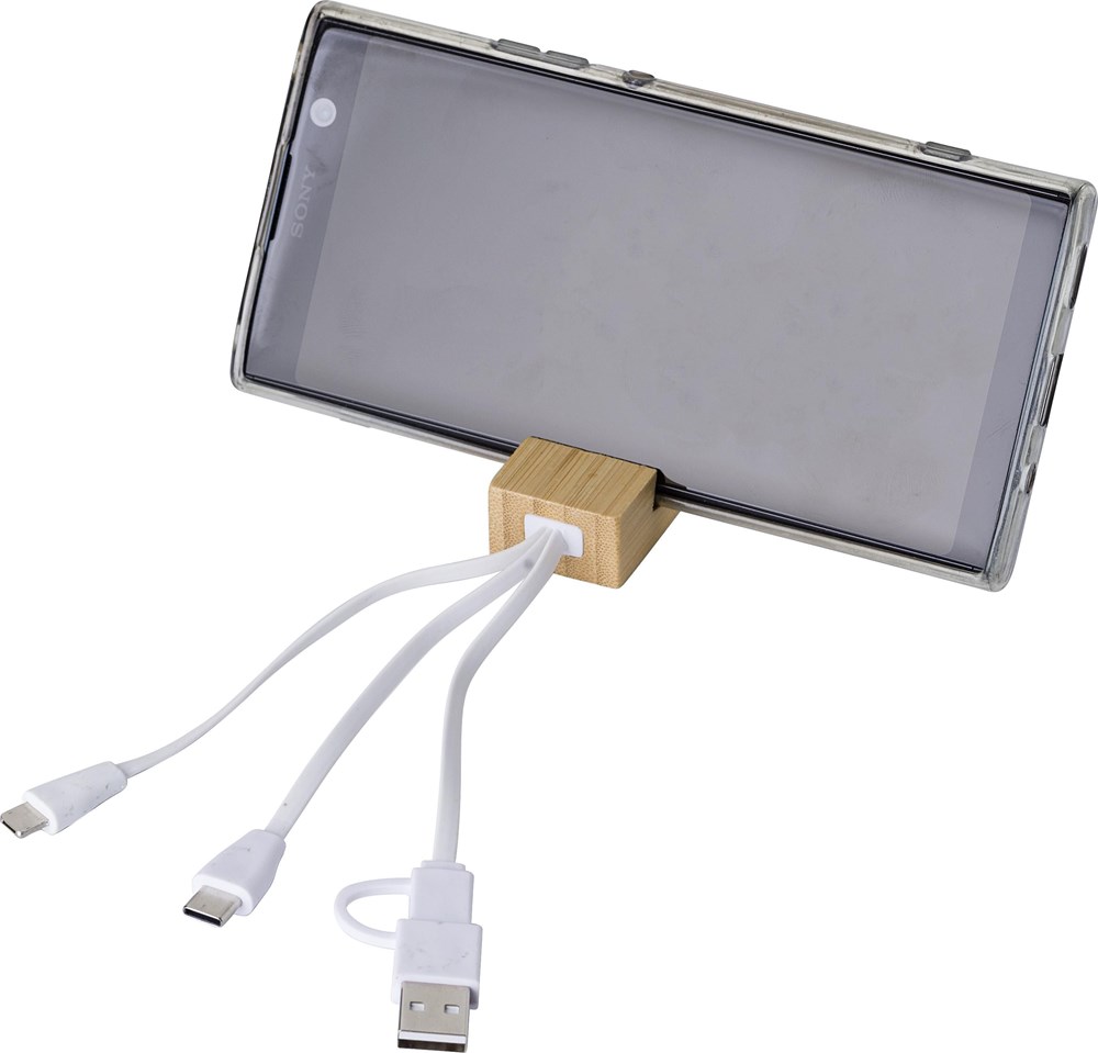 This is the Sutton Bamboo Keyring Charger. It combines a durable bamboo keyring with an integrated phone holder. It also features a multi-device charging cable system. You get Type-C, Lightning, and USB-A/C connectors. Each unit comes individually packed. It arrives in a brown cardboard bag. You can use this product for various promotional activities.