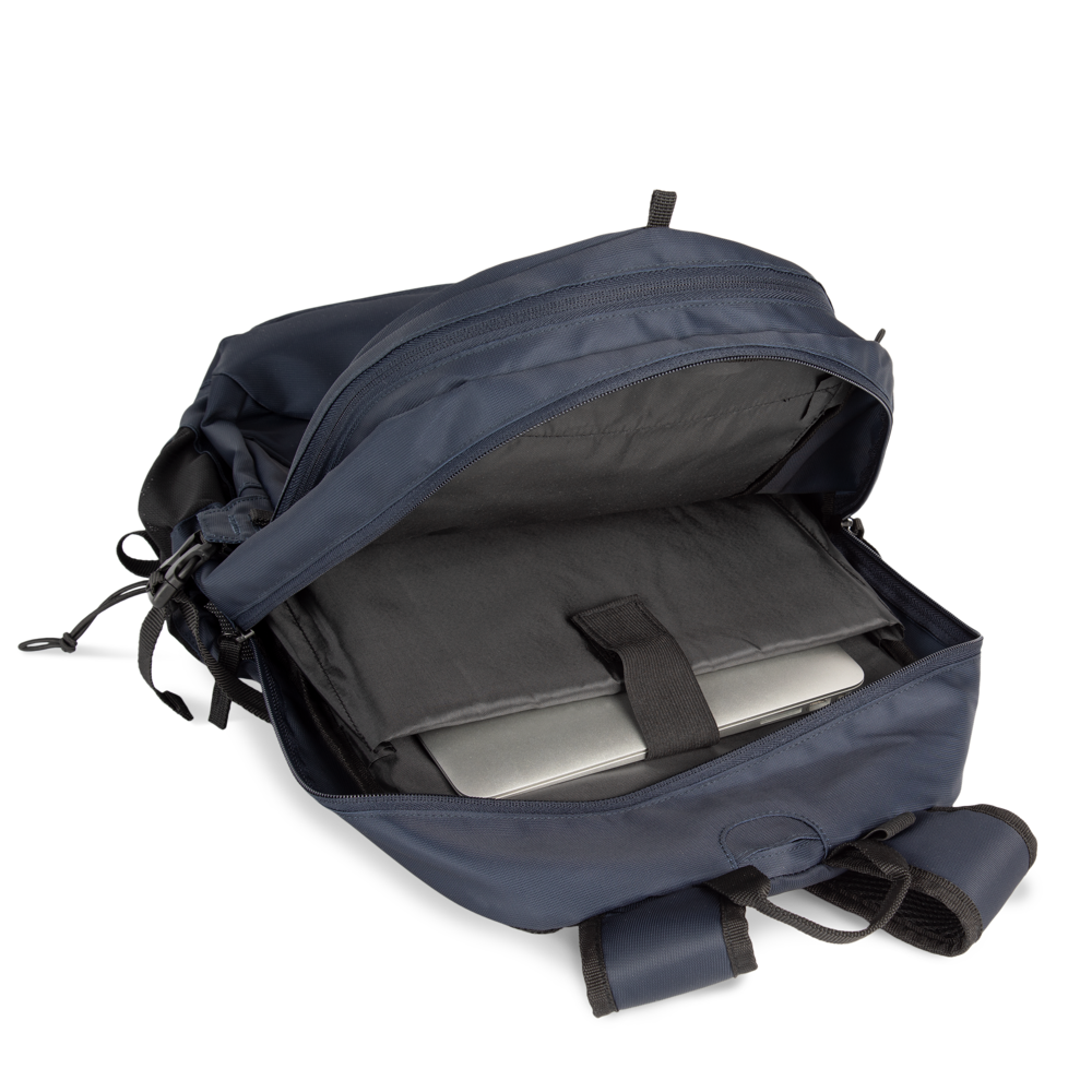The KI0172 Leisure Backpack is crafted from 100% polyester. It features a large main compartment. This compartment holds up to a 15-inch laptop. There is also a large front pocket. An inner divider helps organise your contents. The backpack includes a removable helmet net. This net folds away into a dedicated zip pocket at the bottom. Side compression straps secure your load. A waist strap provides added stability. Elastic mesh side pockets come with a drawstring. Ergonomic shoulder straps offer comfort. The breathable back panel enhances ventilation during use.