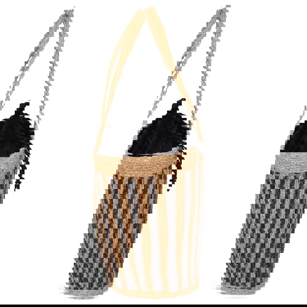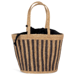 This is a Striped Seagrass Basket. It offers a 26L capacity. The basket is hand-woven from 100% natural seagrass. It features an inner lining in Black Night. This lining consists of 70% recycled cotton. It also contains 28% recycled polyester. The remaining 2% is other material. The basket closes securely with a tunnel cord. It is equipped with flat braided handles for carrying. The size is 19 x 30 x 31 cm.