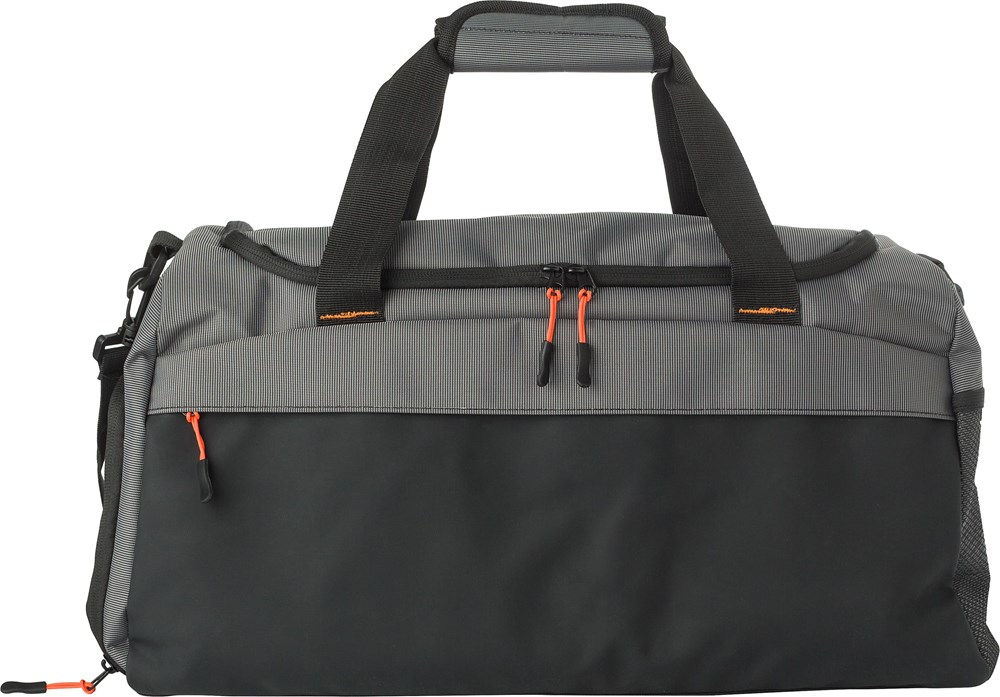 The bag is made from durable 500D Two Tone material. It includes a front pocket with a zip closure. A ventilated side compartment holds shoes separately. A mesh pocket is on the other side. The short handles feature a comfortable velcro closure. The main compartment is spacious. It has a reinforced bottom for extra durability.