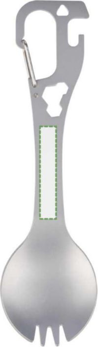 The Stainless Steel Spork Noe is crafted from durable stainless steel. It features an integrated fork and spoon. The handle includes a flat screwdriver, a bottle opener, a can opener, and three Allen keys. A carabiner is included for easy attachment. Each spork is individually packed in a paper bag.