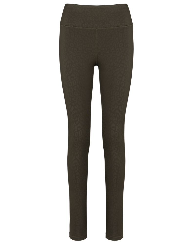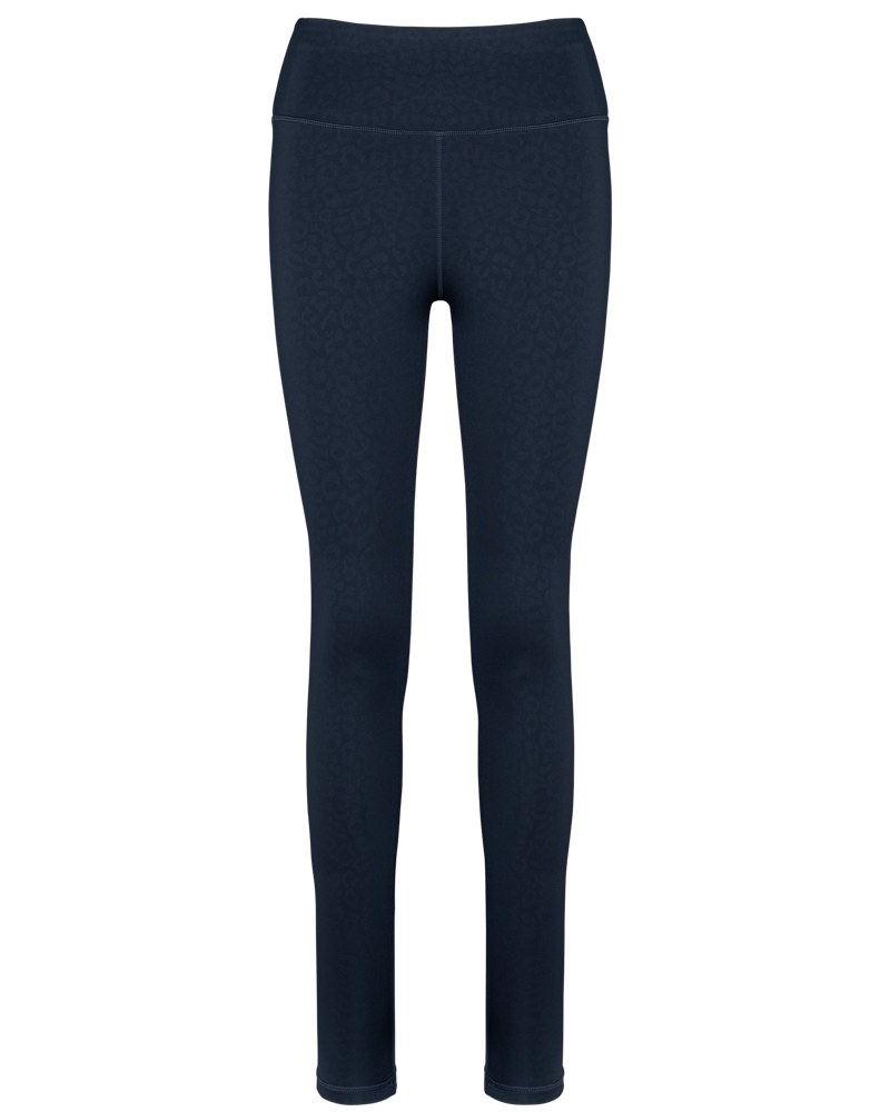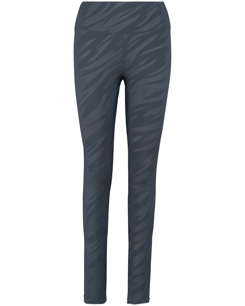 This legging is made from 81% recycled polyester. It contains 19% elastane. This material blend offers both flexibility and durability. The fabric is soft to the touch. It has a printed tone-on-tone motif. This motif provides a subtle sheen.