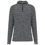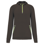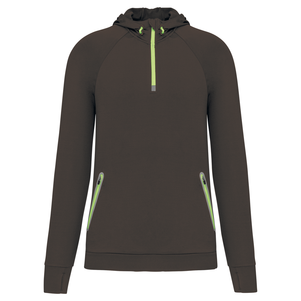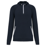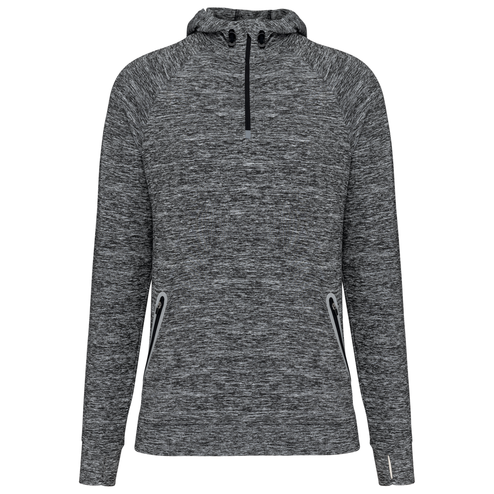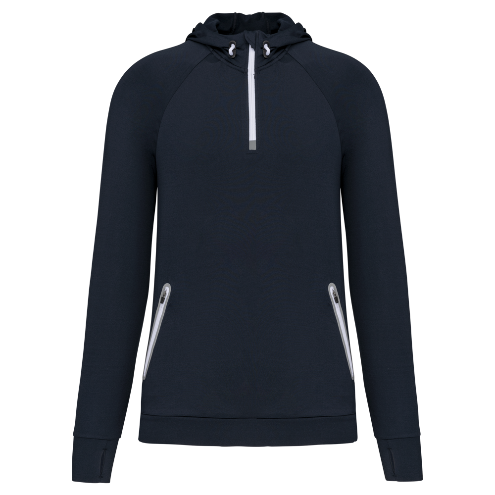 This is a customizable hooded sportsweater. It features a practical zip collar. The fabric is made from ultra-soft brushed jersey. It combines 90% polyester with 10% elastane. This sportsweater is designed for durability and comfort.