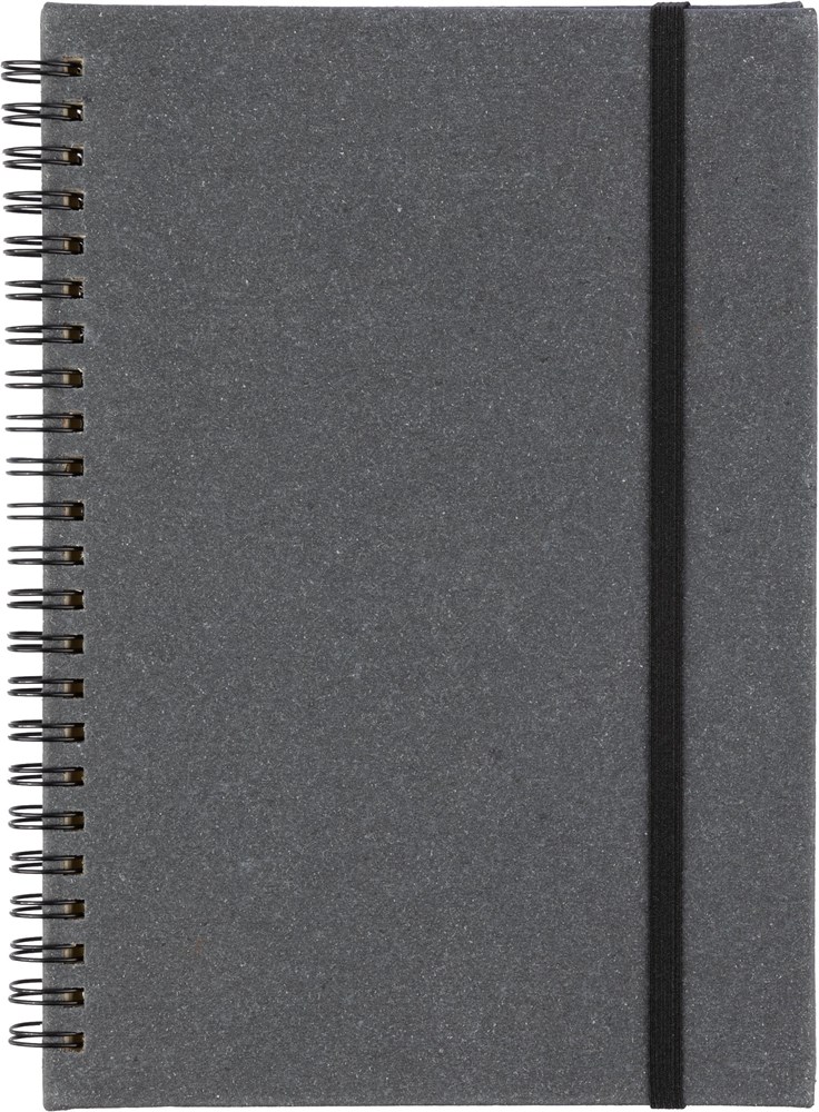 This notebook features a cover made from recycled leather. It is an A5-sized notebook. Each notebook includes 80 pages. The paper quality is 70 grams. The back cover shows a subtle relief of the recycled leather. This notebook is a sustainable choice for your brand. It is available in black and brown.