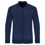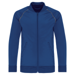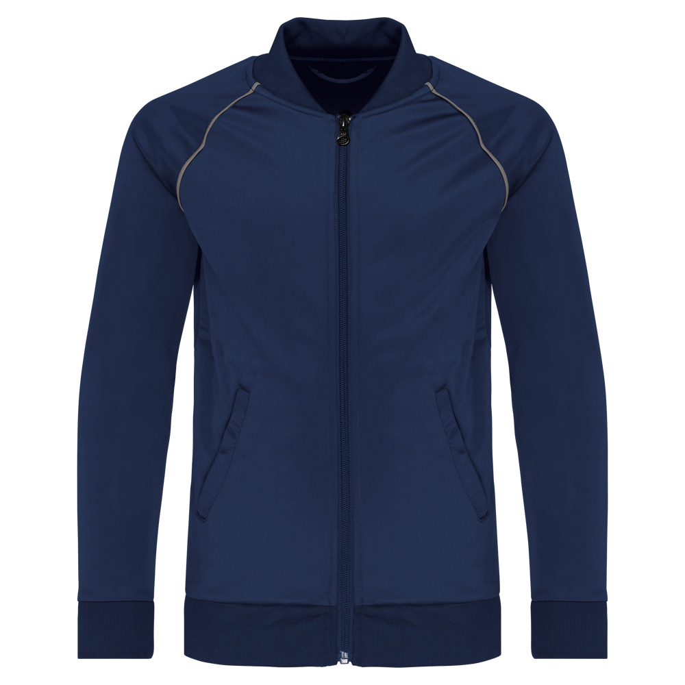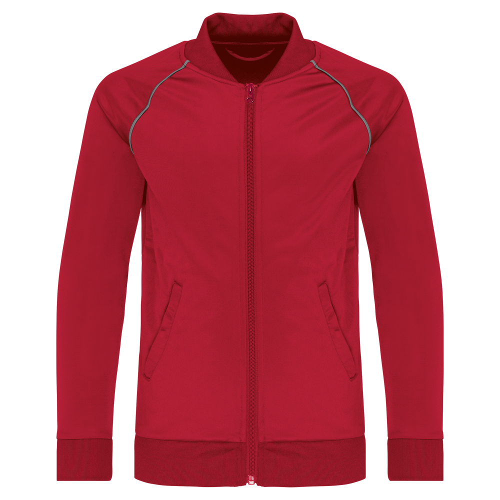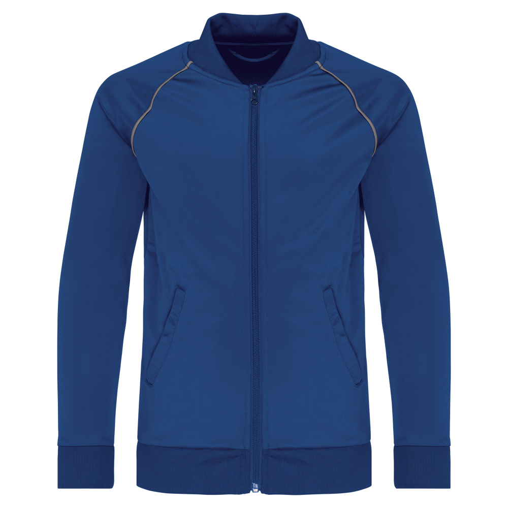 This is a kid's training jacket. It is made from durable tricot polyester. This jacket is ideal for branding with your custom logo. It features a straight cut. Raglan sleeves provide comfort. The jacket includes ribbed cuffs and hem. Two zip pockets offer practical storage.