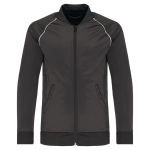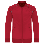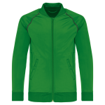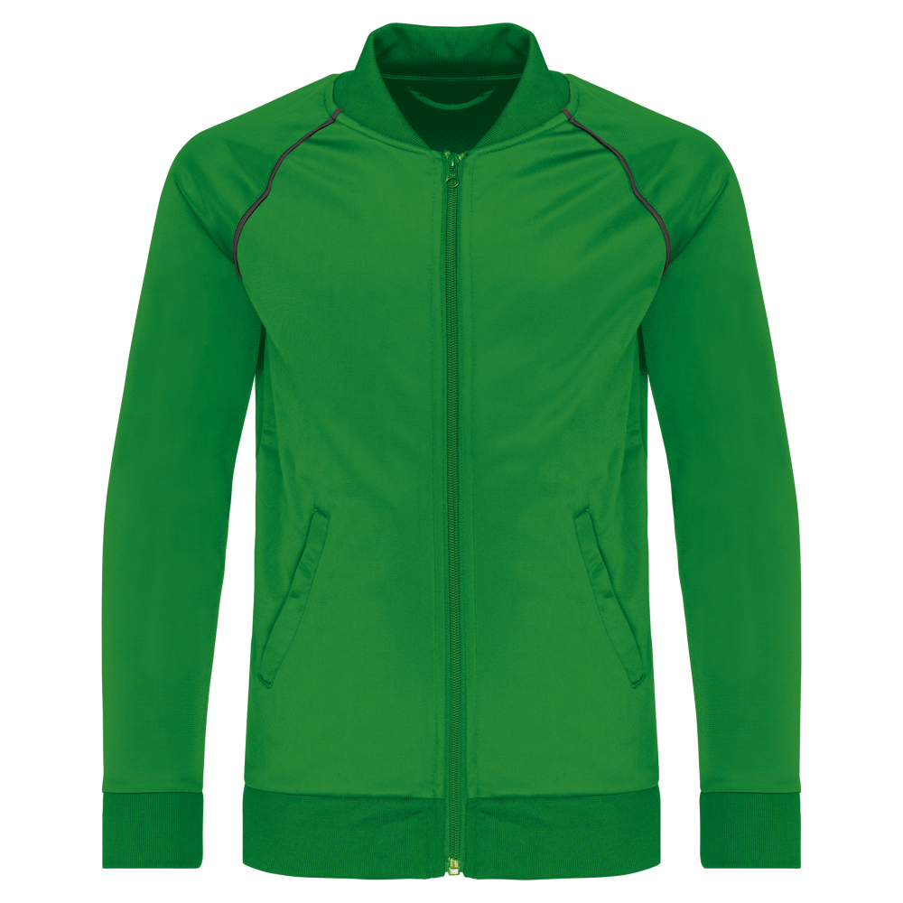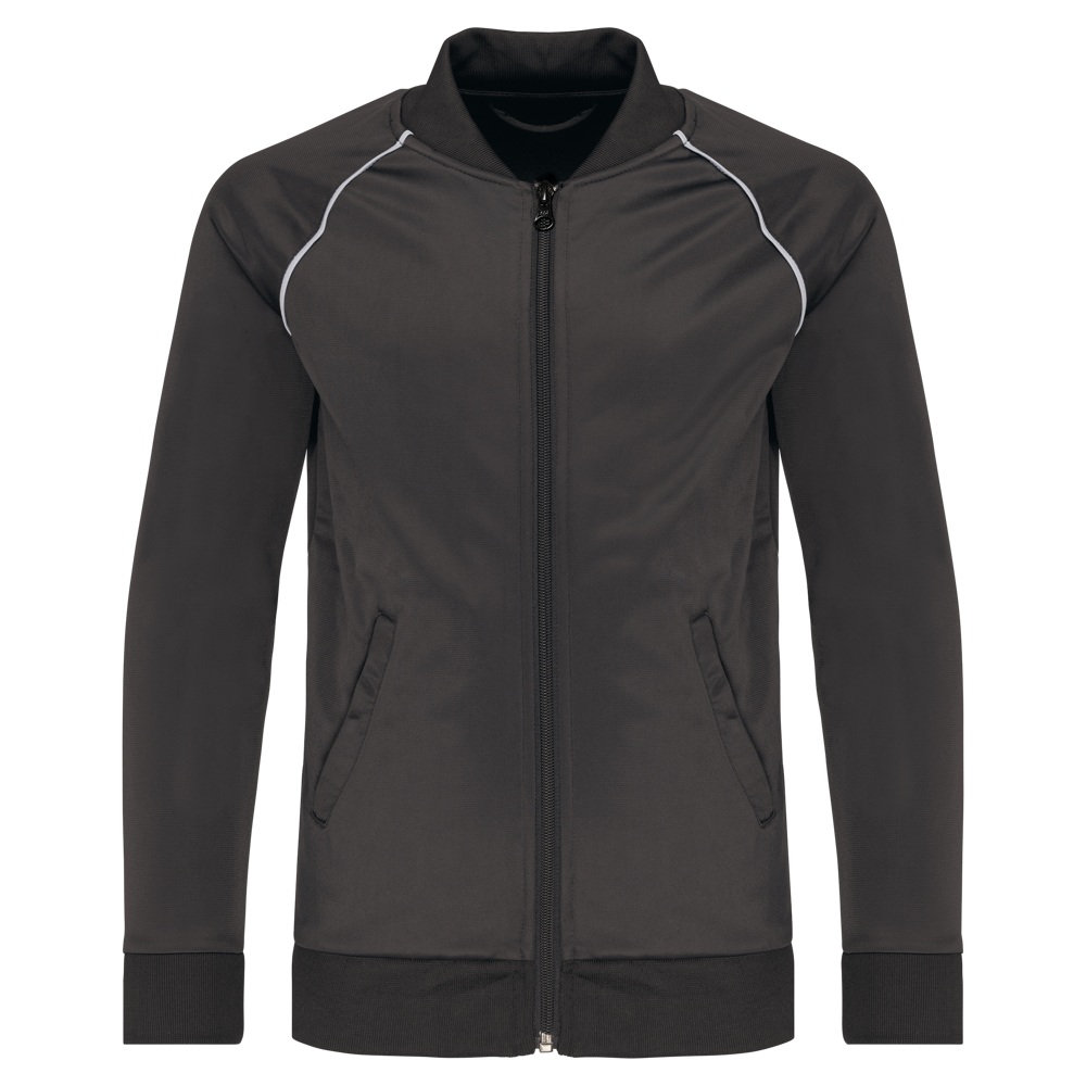 The jacket is made from 100% tricot polyester. It features a straight cut. A tone-on-tone nylon zipper is included. Raglan sleeves have contrasting piping. It is equipped with 1x1 ribbed cuffs, collar, and hem. Two side zip pockets provide secure storage. A tear-away brand label allows for easy customization. Available sizes include 6, 8, 10, 12, and 14 years. Colors offered are Black, Dark Grey, Green, Dark Royal Blue, Sporty Navy, and Sporty Red.