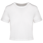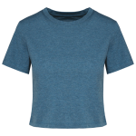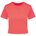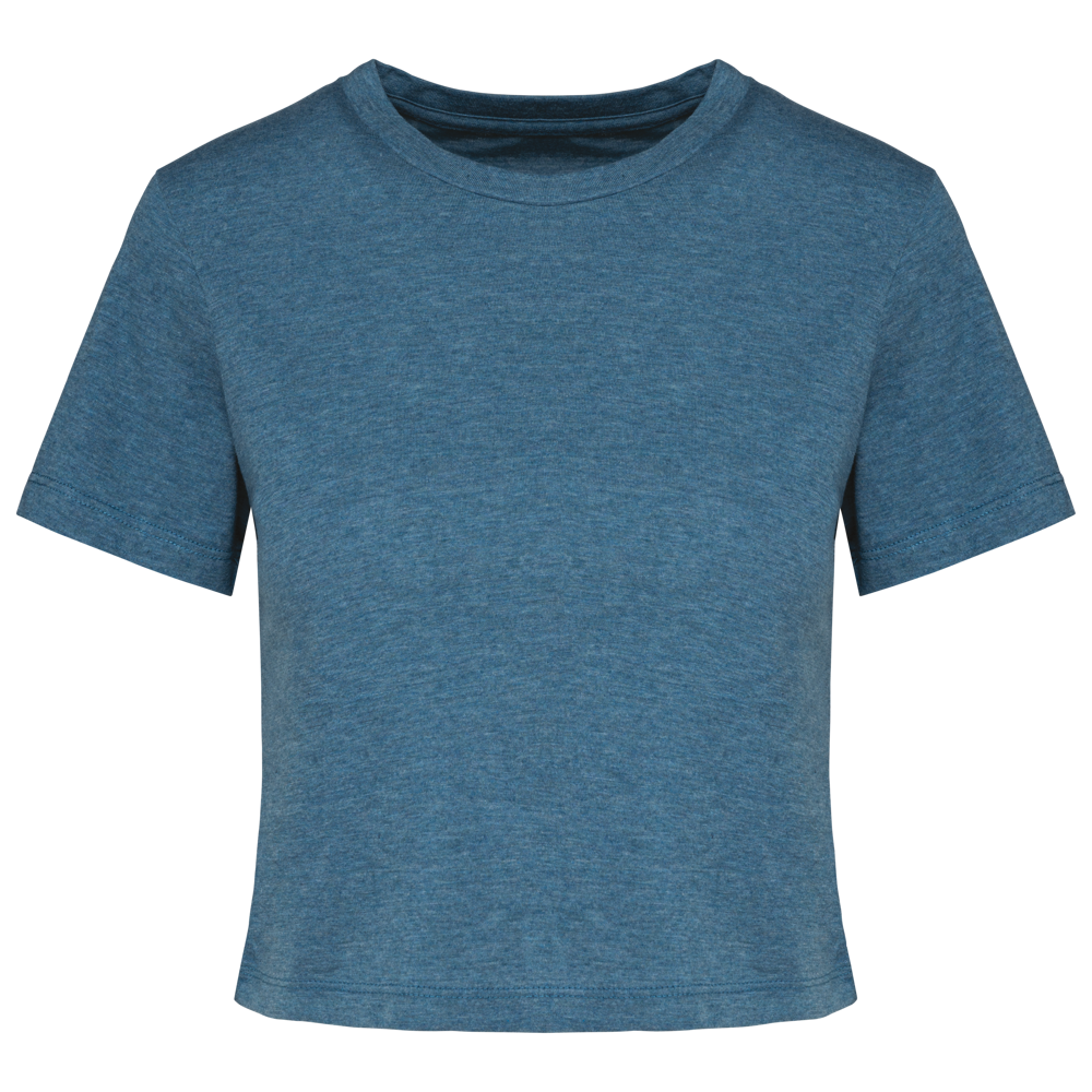 This is the Women's Crop Top PA4022. It is a label-free triblend crop top available in sizes S to XXL. You can order it in Black, White, Coral, or Duck Blue Heather. This crop top is designed for easy personalization.