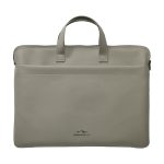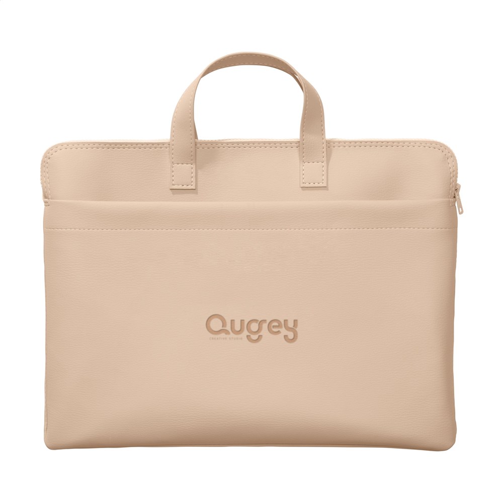 This laptop bag fits laptops up to 16 inches. It is crafted from vegan apple leather. The material incorporates recycled apple pulp. The bag features a reliable YKK zipper. It has two comfortable handles. A convenient front pocket offers extra storage. The main compartment is spacious. It provides room for a charger, documents, and a notebook. The interior lining is made from 100% recycled PET. The bag is available in Black, Beige, and Taupe colors.