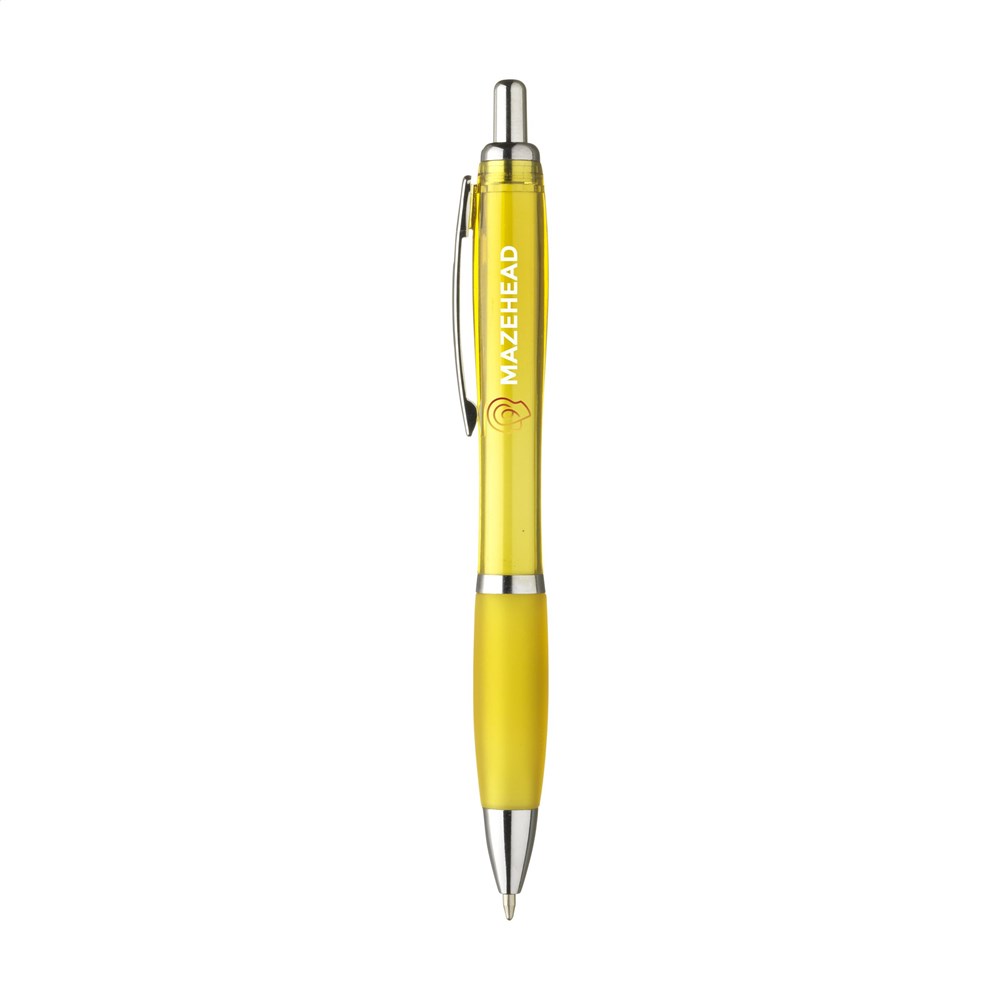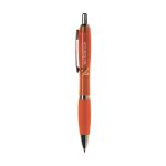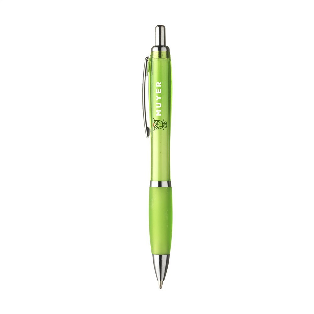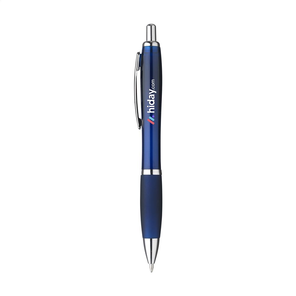 The Athos pen is a functional ballpoint pen designed for professional and promotional use. It features a transparent colored barrel and a sturdy metal clip. You can choose between black or blue ink based on your writing preference. This pen combines a modern look with a practical design for daily writing tasks.