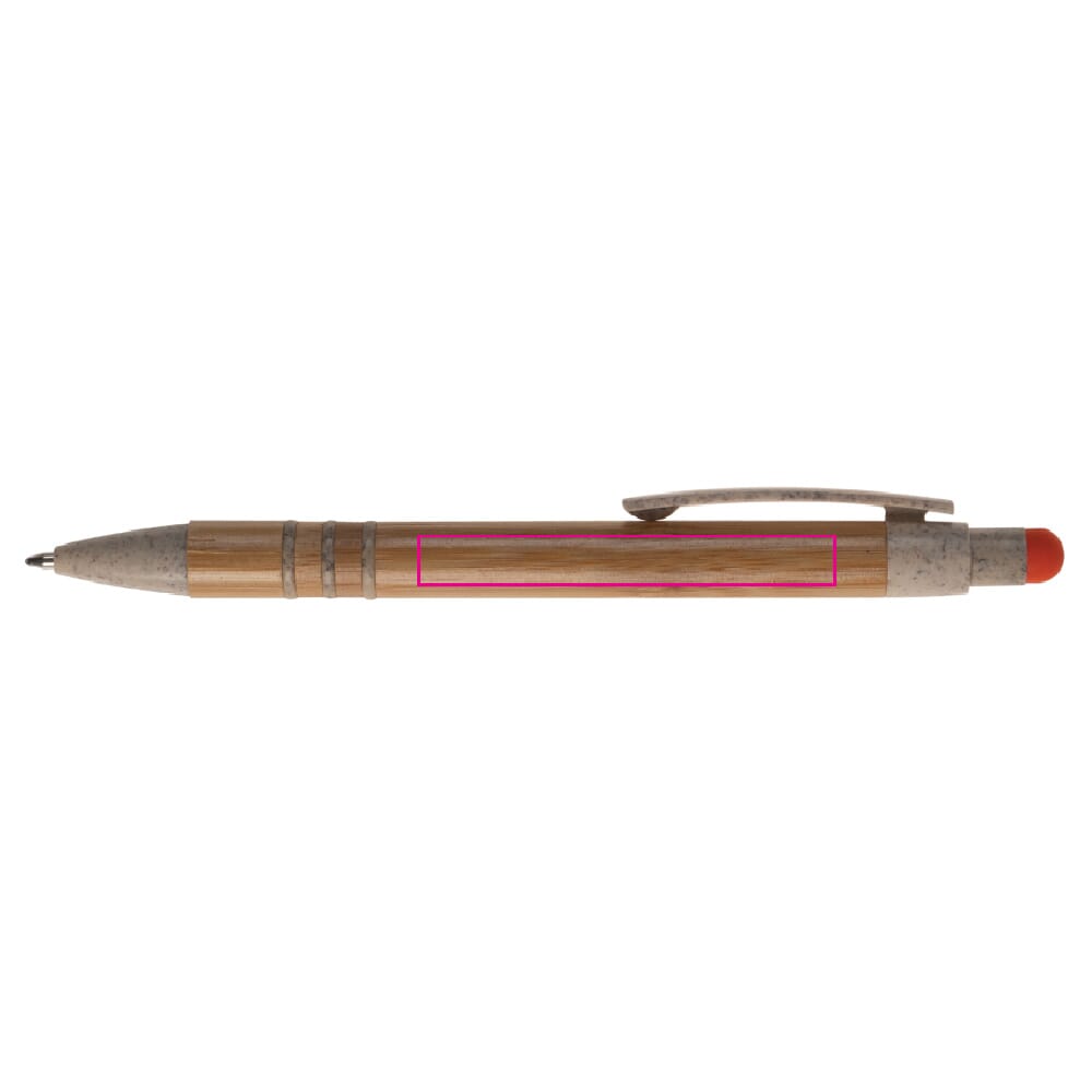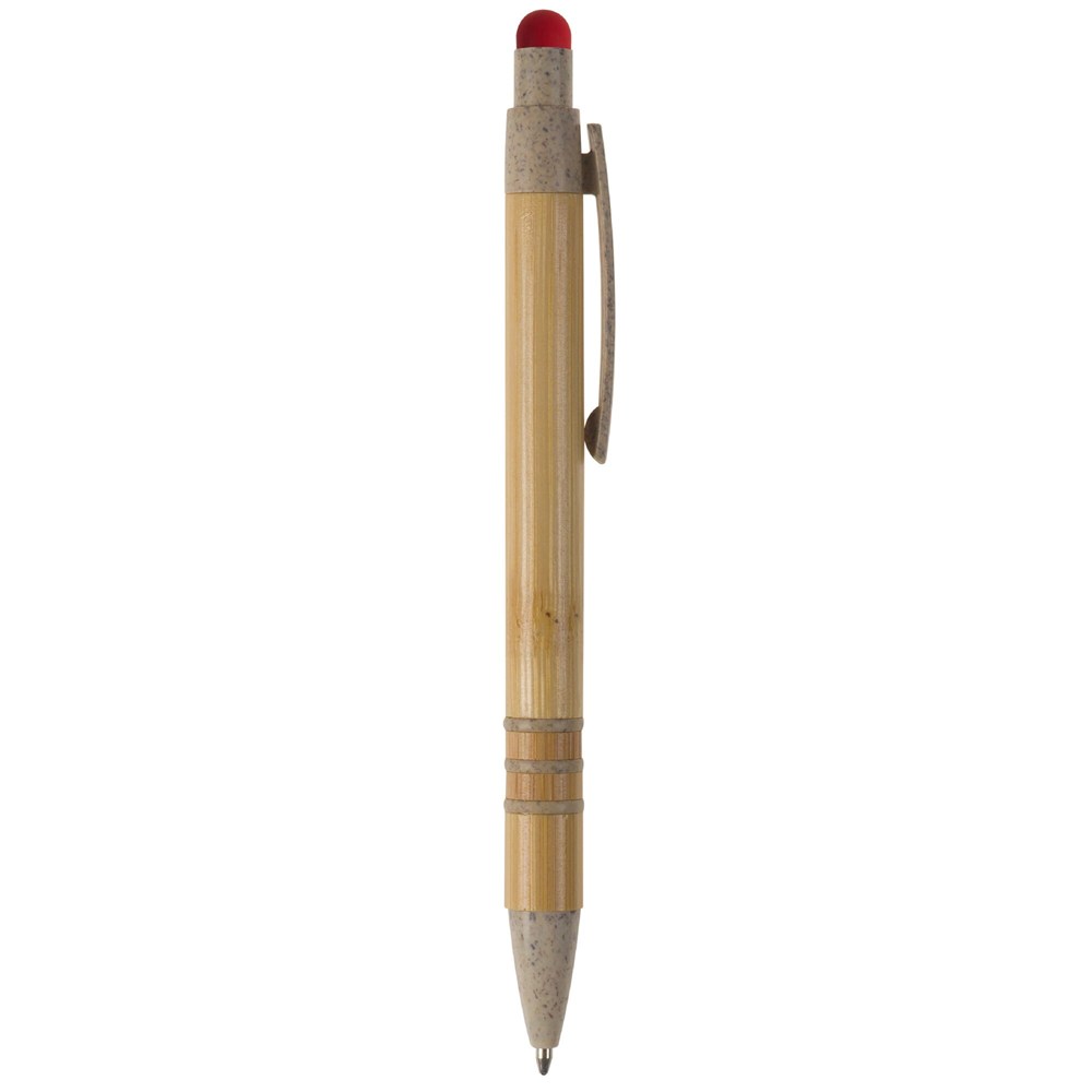 Ball pen with bamboo barrel. The tip, clip, pusher, and barrel rings are made of wheat straw. On the pusher is a coloured stylus for smartphone use. A versatile promotional item, complete with a blue-writing jumbo refill.
