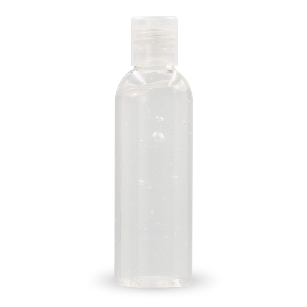 The bottle contains 100 ml of hand gel. The gel has an alcohol content of 70%. Its compact size allows for easy carrying. The product is manufactured in Europe. The bottle is transparent, showcasing the clear gel.