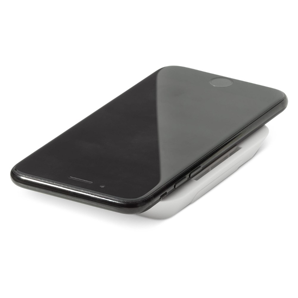 5W wireless charging station that double up as a phone stand. Connect the charging pad to a power source and charge your phone without a cable. The product has a soft touch finish. Comes packaged in a gift box.