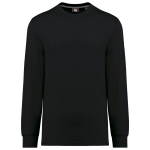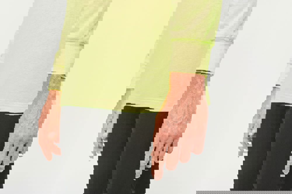 Effen kleuren: 100% katoen. Gemaakt van 100% biologisch katoen. Gevlamde kleuren: 90% katoen / 10% viscose. Gemaakt van 90% biologisch katoen. Fluokleuren: 65% polyester / 35% katoen. Gemaakt van 65% gerecycleerd polyester. Regular fit. Ronde halsopening in 2×1 ribboord met elasthan en silver nektape op de effen en heather kleuren en toon-op-toon op de fluokleuren. Afwerking met dubbel stiksel onderaan. Tear-away merklabel.