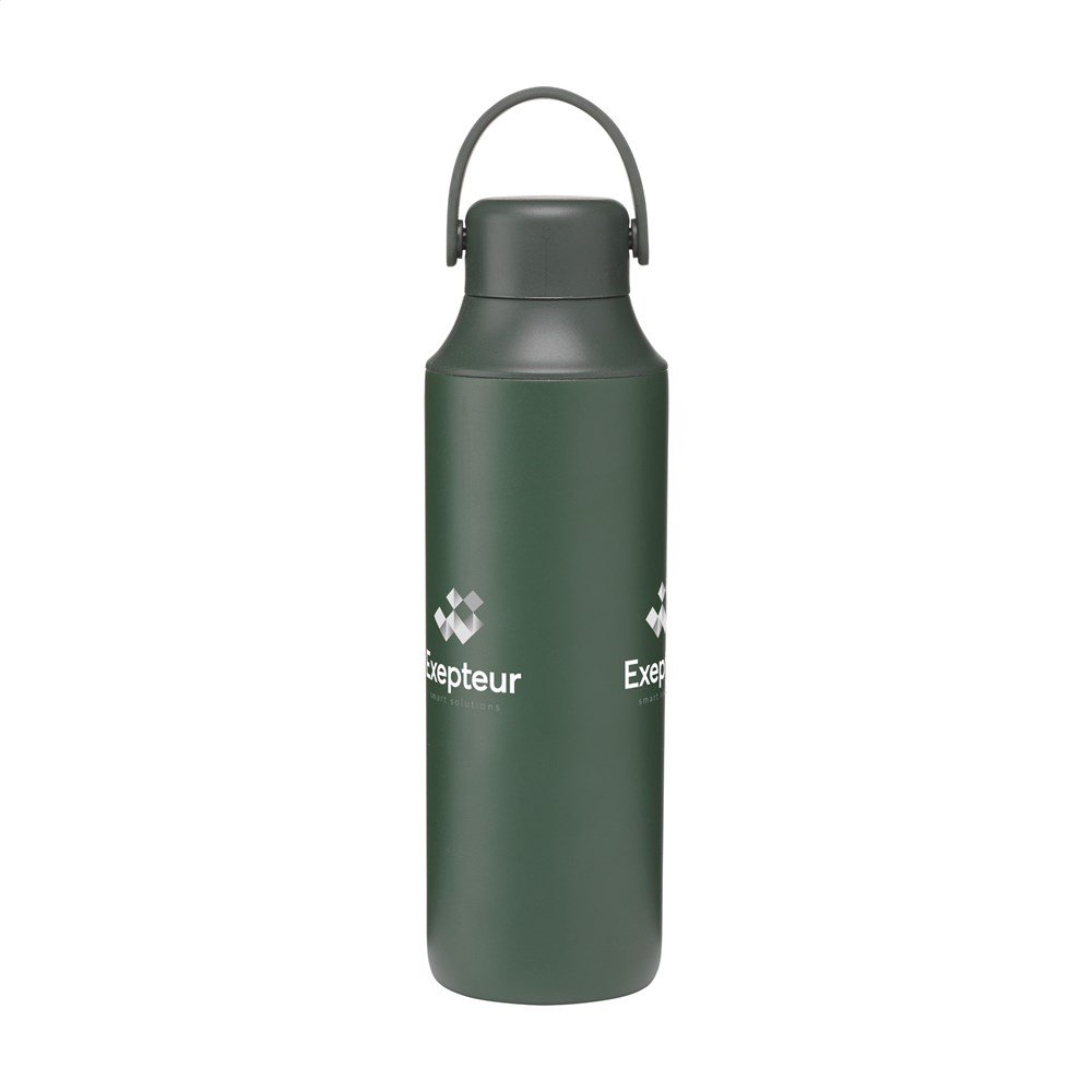 This 600 ml insulated bottle is made of double-walled recycled stainless steel. You can use this bottle to keep your hot or cold drinks at the right temperature for a long time. The product features a leak-proof design with a practical silicone carrying loop. It is RCS-certified and consists of 72 percent recycled material. The bottle is finished with a durable powder coating and fits in most cup holders.