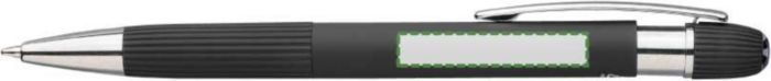 Recycled aluminium ballpen with a rubberized finish. Features striped details on the grip and topside, a chromed plastic tip, and push button with metal clip. Includes a laser-engraved recycled logo. Blue ink.