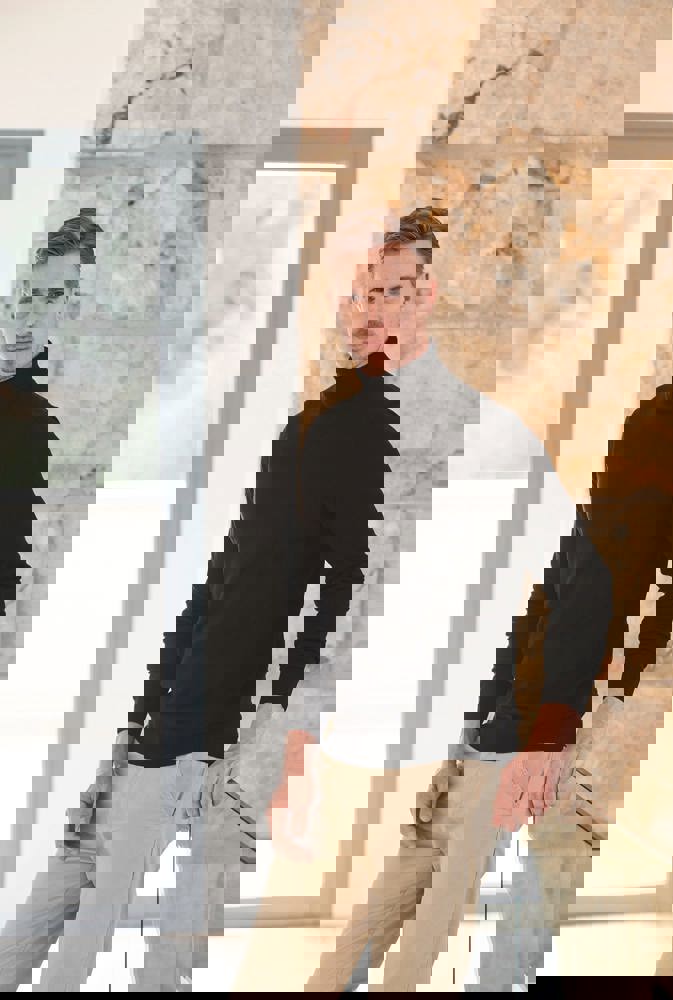 50% katoen / 50% acryl. Rolkraagtrui uit fijn breisel met lange mouwen voor mannen. Semimodieuze mouw met 1×1 geribde rolkraag, zoom en manchetten. Uitneembaar label.