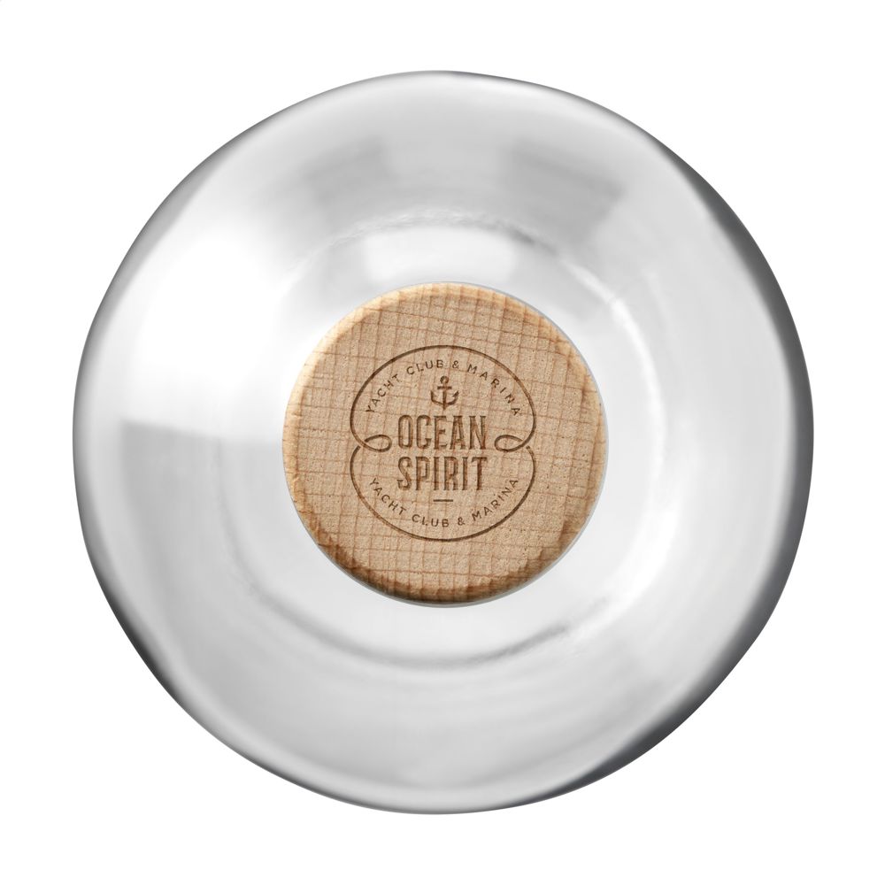 The bottle is made from high-quality glass. The cap features wood with a synthetic cork insert. It has a capacity of 700 ml. The glass bottle is dishwasher safe. The wooden cork cap is not dishwasher safe. Hand washing is recommended to preserve any applied print. This product is Made in Europe.Delivery & Production