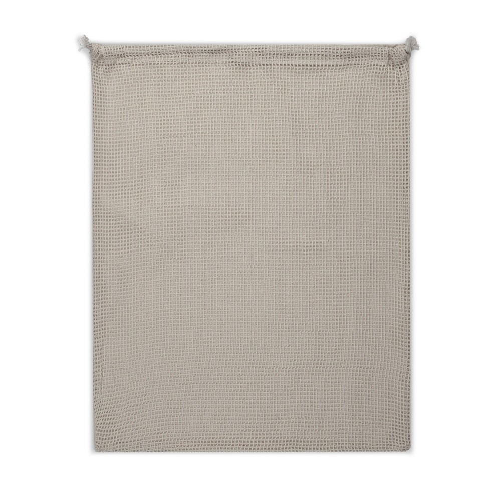 This reusable bag is made from unbleached cotton. It features a net design. The material is OEKO-TEX certified. This ensures ecological safety. The bag measures 40x45cm. Its color is natural ecru. You can wash this bag. Washing at low temperatures is recommended. Minor shrinkage may occur after washing. The bag is durable for repeated use.