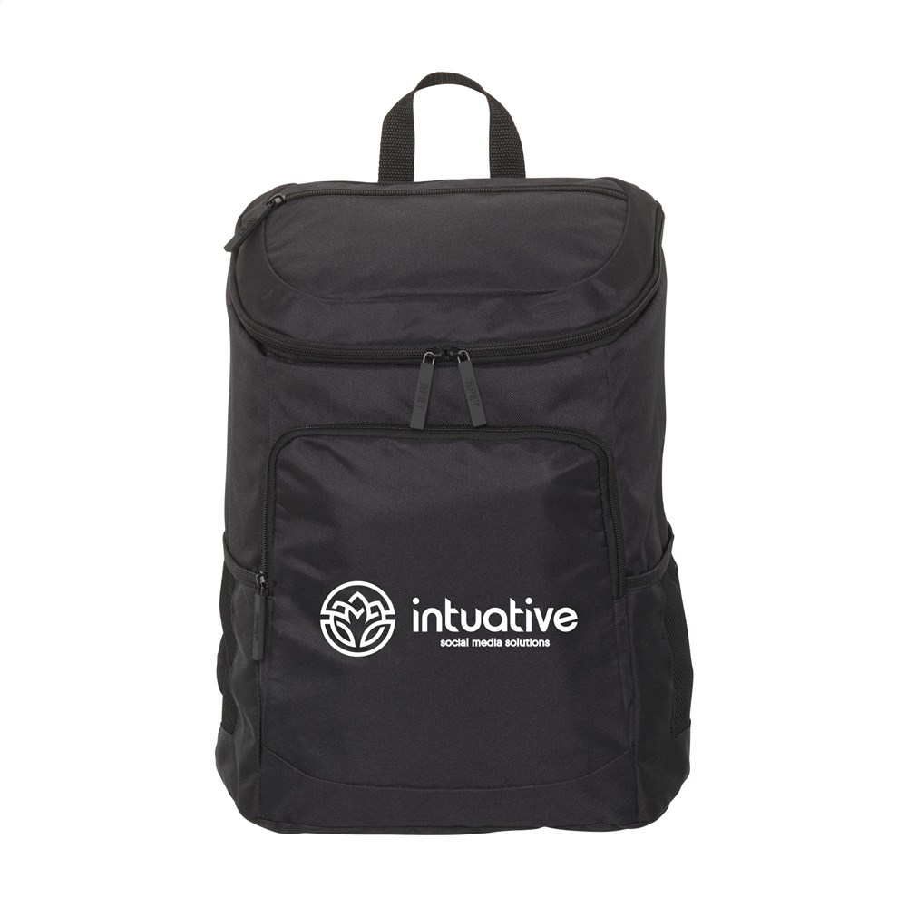 This cooler backpack is made from 600D RPET polyester. It features a spacious cooling compartment. The compartment has a 4 mm thick PEVA lining. This lining is completely leak-proof. The backpack includes a front zipper pocket. A mesh pocket is on the side. This is convenient for carrying your drink bottle. It has a foam-padded back. The shoulder straps are padded and adjustable. A carry loop is also integrated. This product is GRS-certified. It contains 50% total recycled material. The capacity is approximately 23 liters. It is available in black.