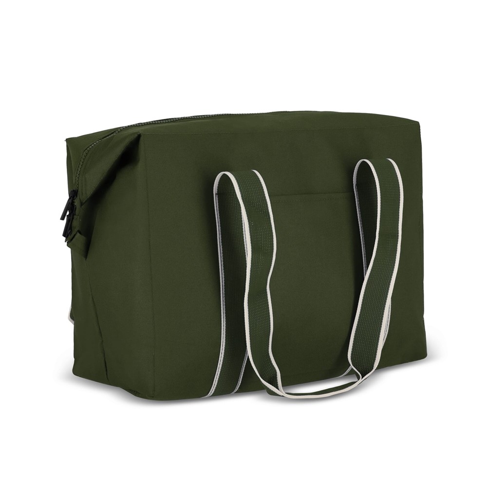 The Koli cooler bag is made from durable rPET (recycled PET). Its main compartment has aluminum insulation. This keeps food and drinks cool for longer periods. The bag features a sturdy zipper closure. It has a non-insulated front pocket for extra storage. You can unfasten the sides to expand its capacity. Sturdy handles ensure comfortable carrying. This product is available in Black, Dark Blue, Olive Green, and Ecru.