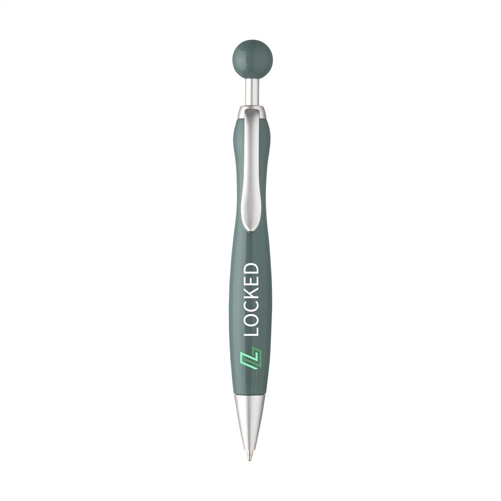 This is a Jolly ballpoint pen. It features a reliable push mechanism. The pen writes in blue ink. It serves as an effective promotional item. The pen is available in grey.