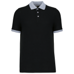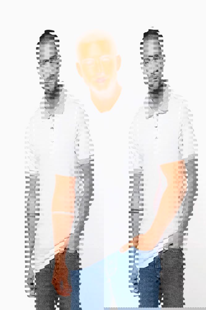 100% voorgekrompen katoen piqué (Oxford Grey: 90% katoen / 10% viscose). Contrasterende ribboord aan de kraag en mouwuiteinden. Contrasterende nektape. Aan de binnenzijde een contrasterende knooplijst met 3 knopen. Afwerking met dubbel stiksel onderaan.